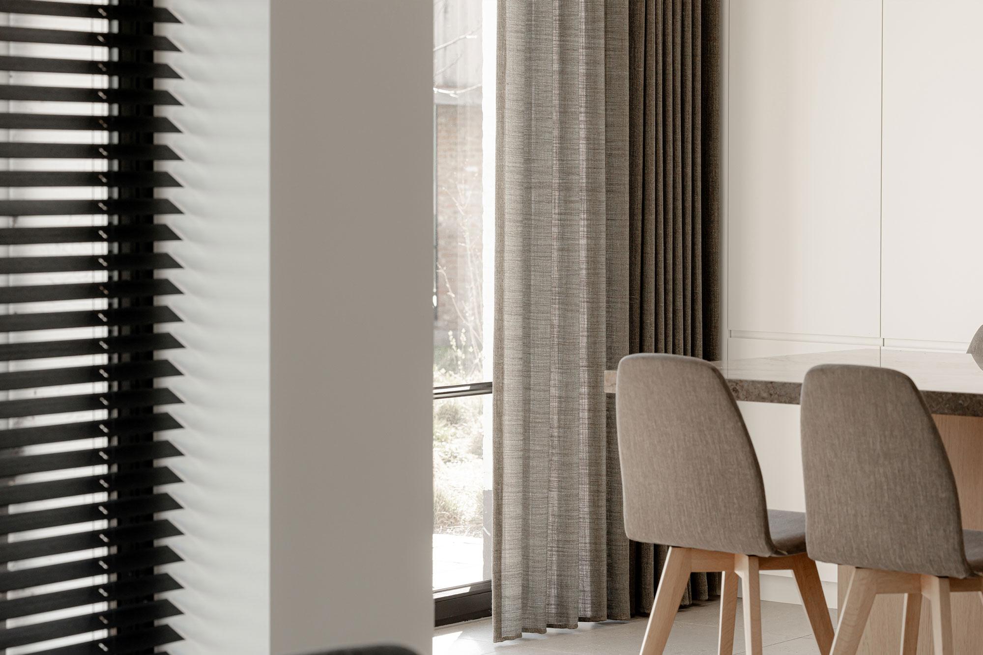 Voor de ramen aan de buitengevel in de leefruimte werd er gekozen voor een gordijn dat qua kleur en gevoel blendt met de tint en textuur van de muren. De stof is volledig afsluitend maar toch nog lichtdoorlatend. Zo blijft er, indien gesloten in volle zomer, voldoende licht aanwezig in de leeftruimte, want de lange gevelmuur geeft uit op het zuiden.