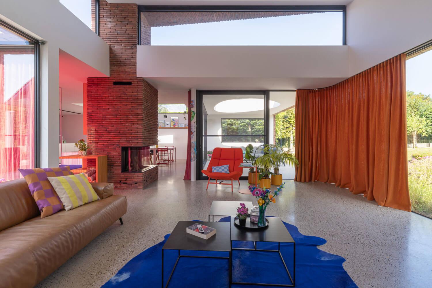 In de leefruimte heb je het gevoel ‘buiten’ te zitten door de grote raampartij. Het gordijn wordt hier een deel van het interieur en vormt een mooie 2de huid indien gesloten. Bij de keuze ervan was het belangrijk dat het contact met de omgeving behouden bleef.