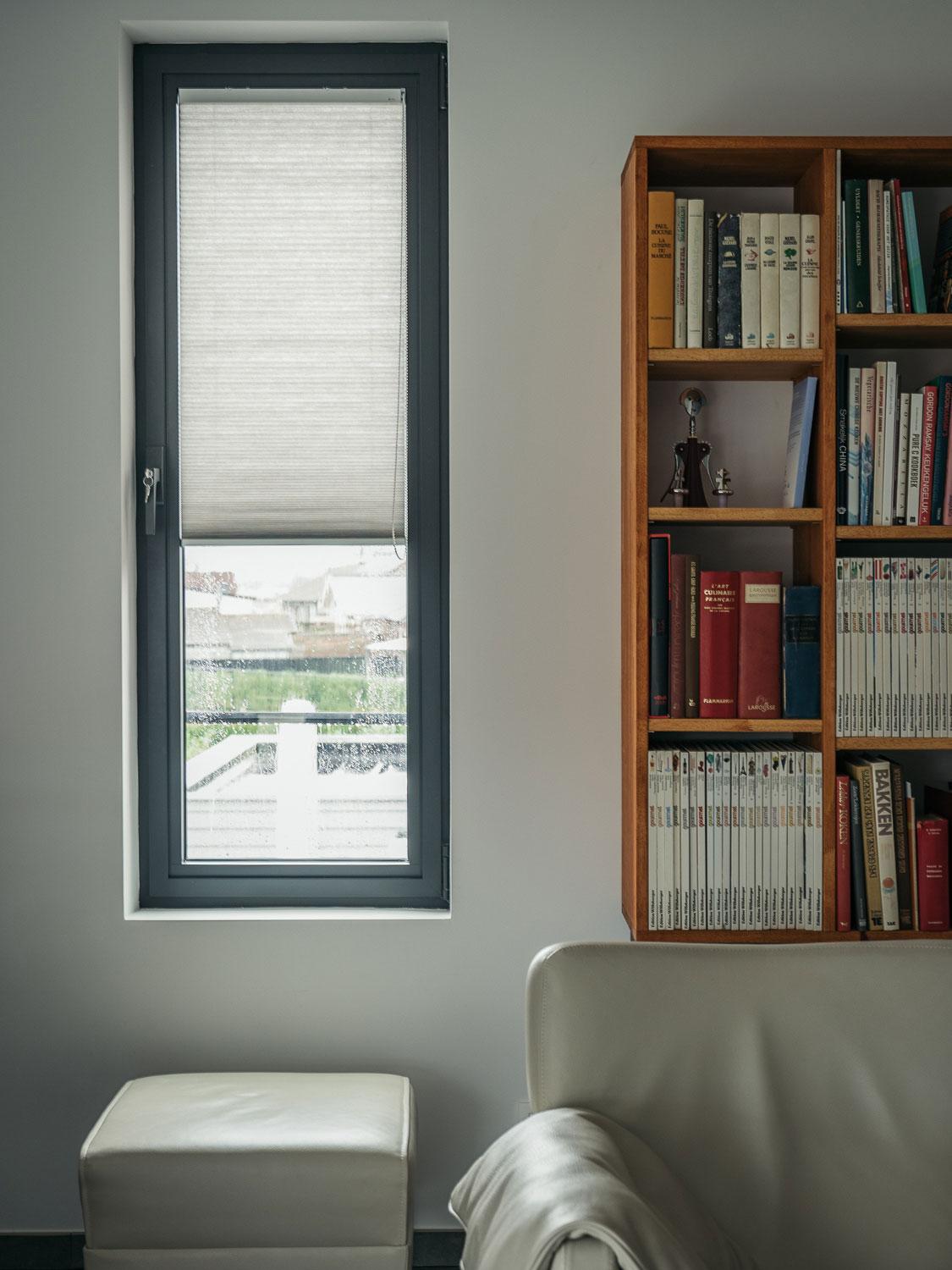 Voor de open leefruimte is er gekozen voor een combinatie van luchtige gordijnen met strakkere Flow shades aan de 2 zijgevels, respectievelijk keuken en zithoek. In de slaapkamer en bergruimte, ook op het gelijkvloers, komt de Washi terug maar in Panel shades die schuiven aan een meersporenrail. Voor de kleinere ramen op het verdiep werd er voor duettes gekozen in verduisterende en lichtdoorlatende kwaliteit, voor respectievelijk slaap- en badkamers.