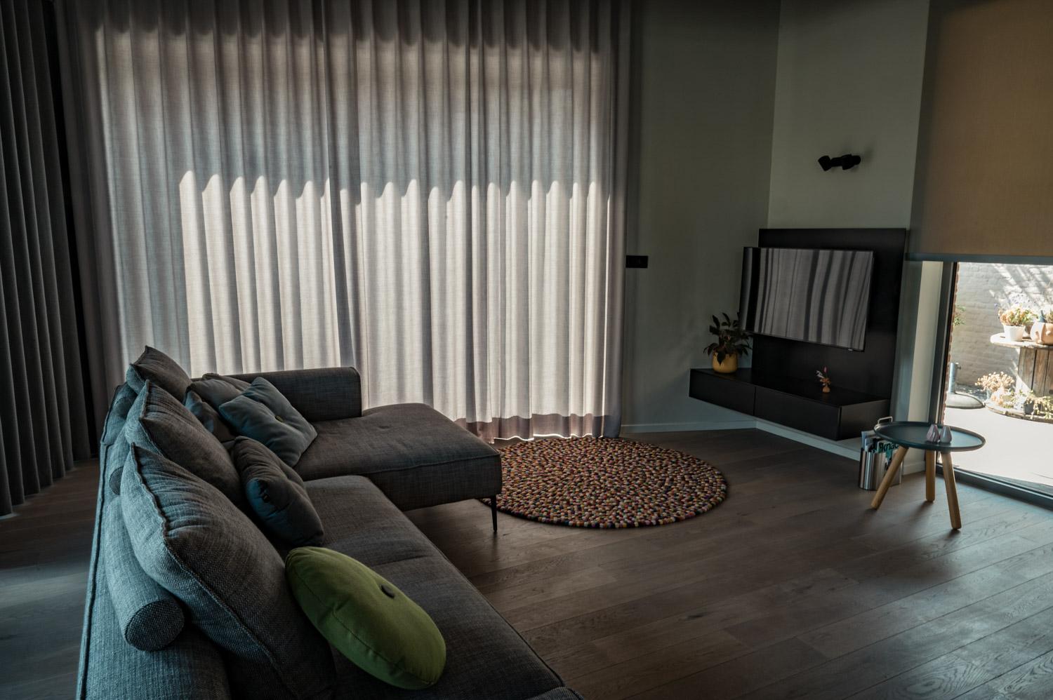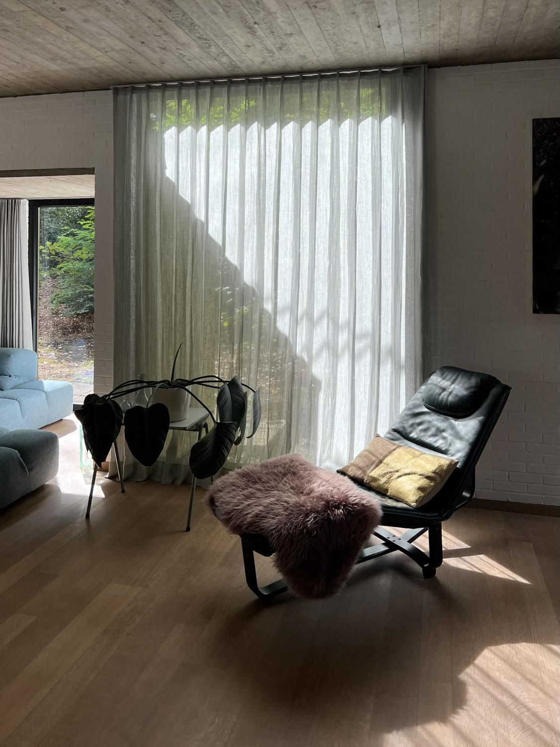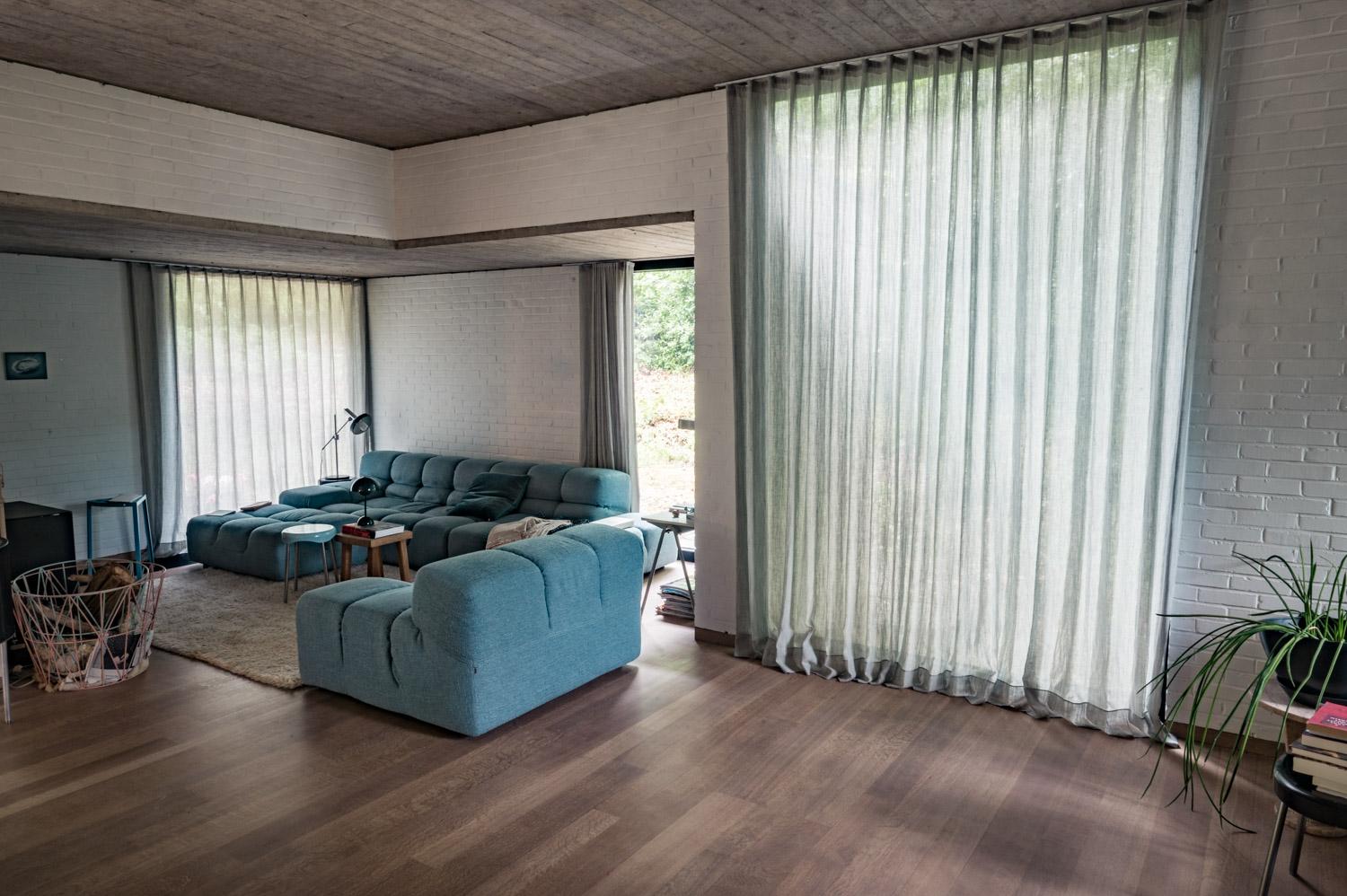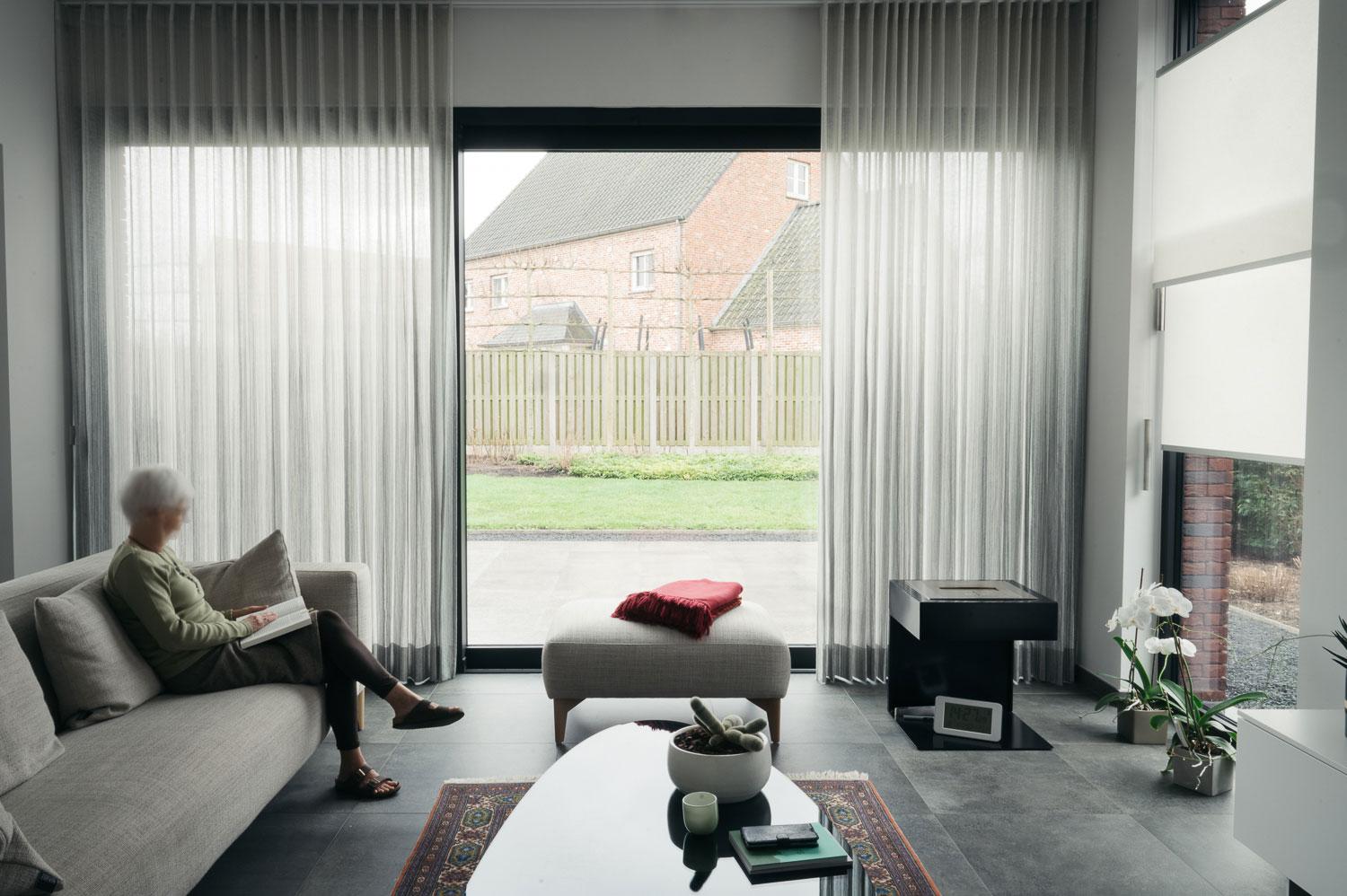In de leefruimte heb je het gevoel ‘buiten’ te zitten door de grote raampartij.  Het gordijn wordt hier een deel van het interieur en vormt een mooie 2de huid indien gesloten.  Bij de keuze ervan was het belangrijk dat het contact met de omgeving behouden bleef.