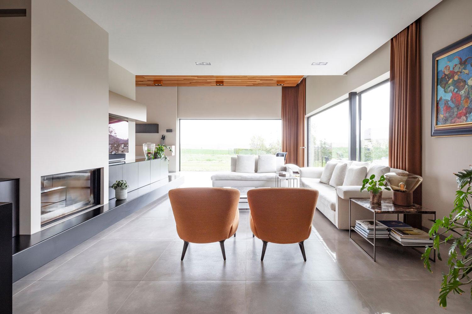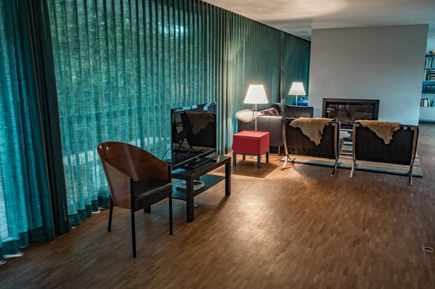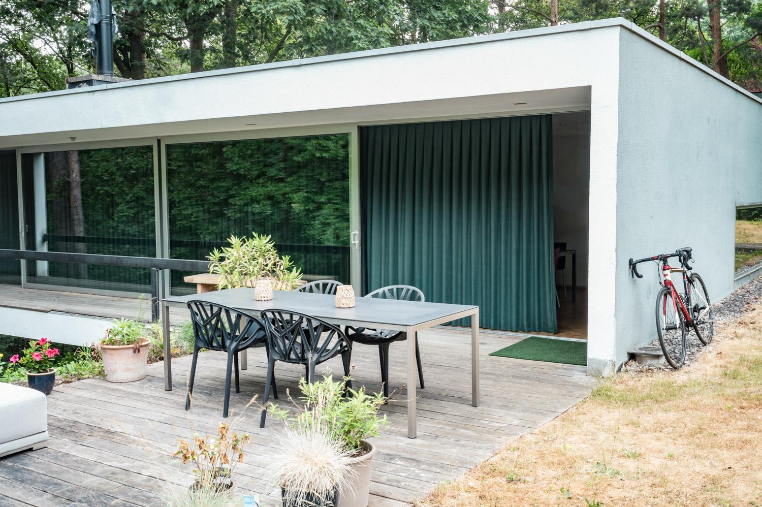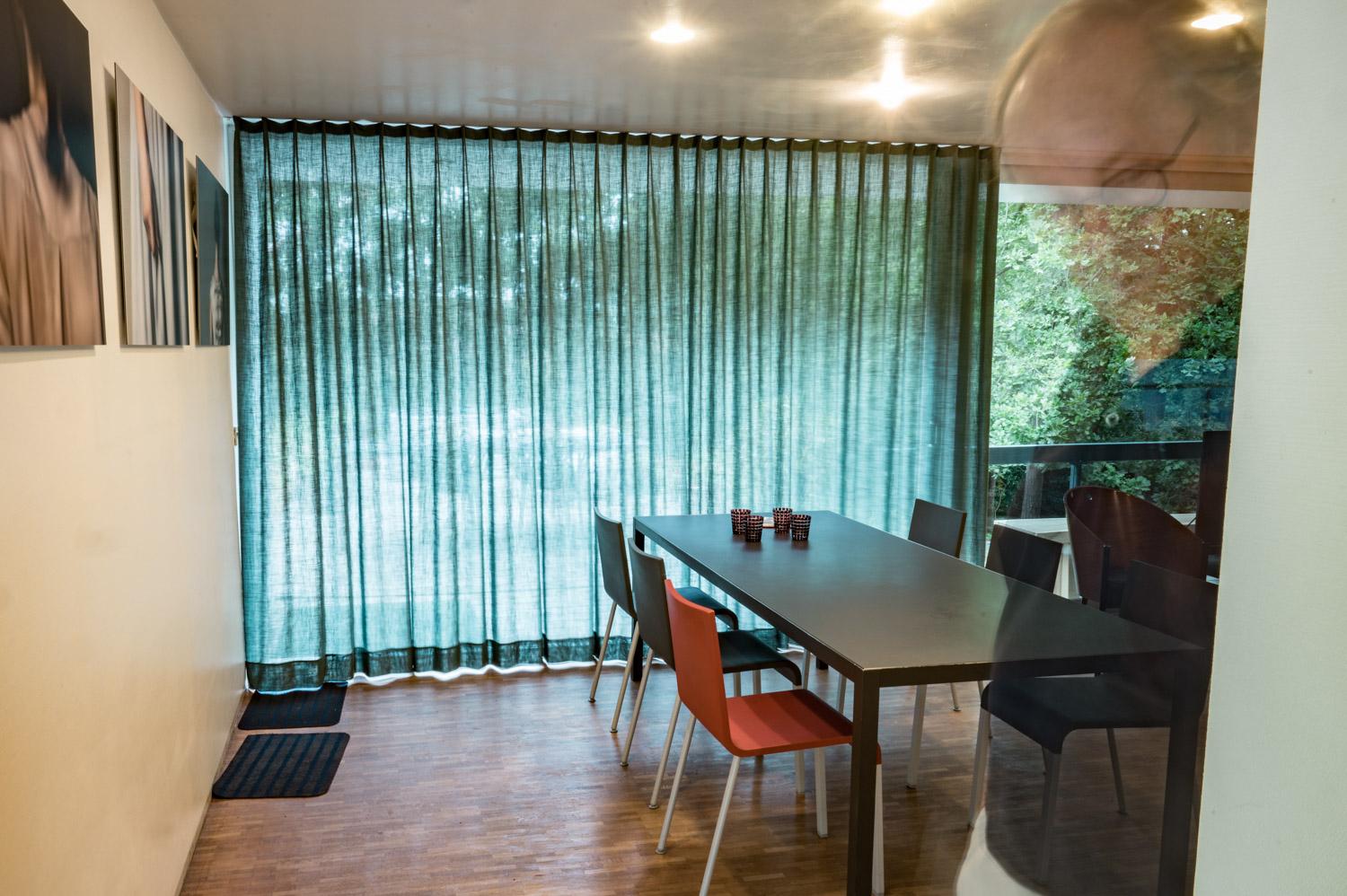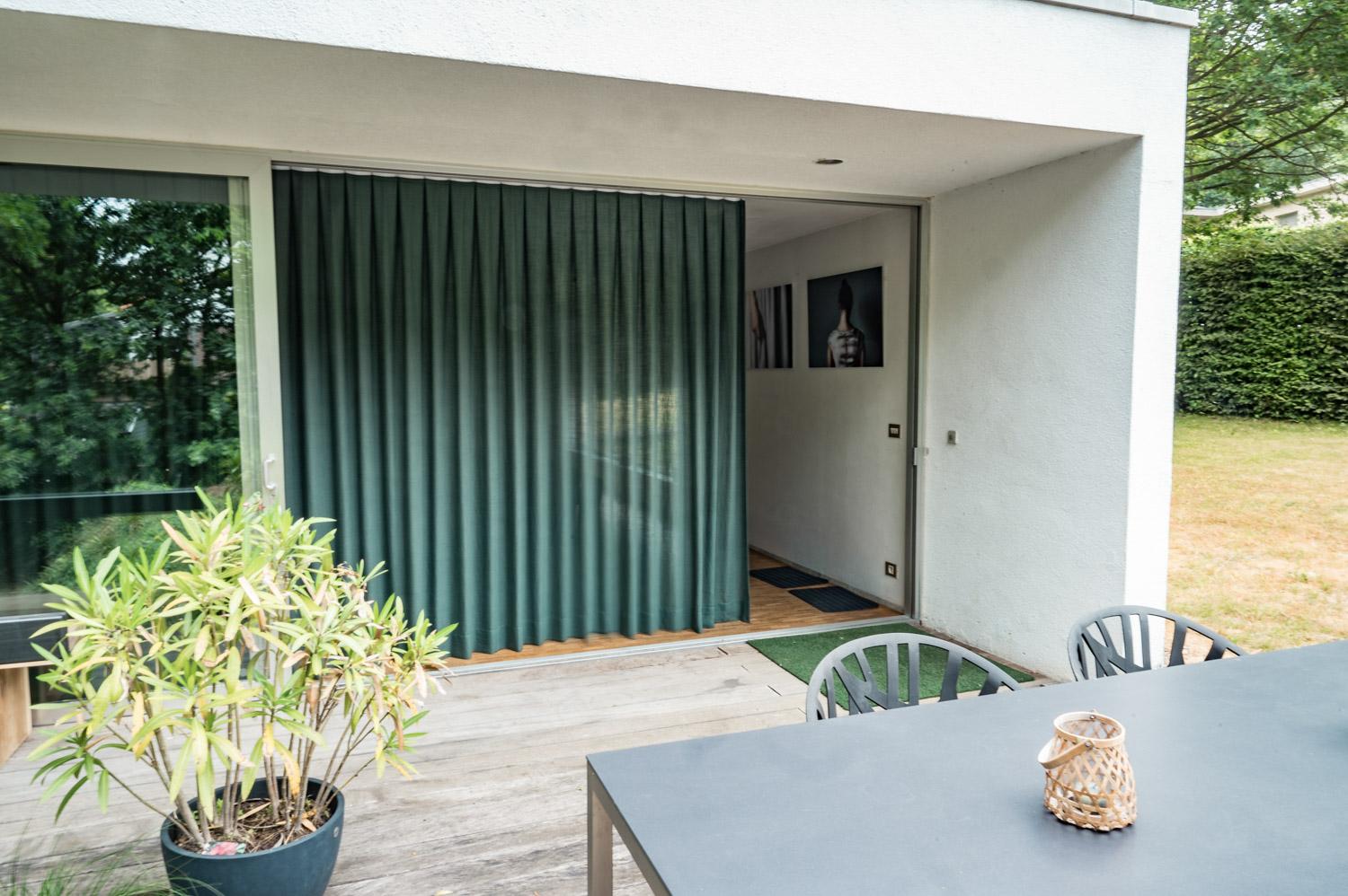 In de leefruimte heb je het gevoel ‘buiten’ te zitten door de grote raampartij.  Het gordijn wordt hier een deel van het interieur en vormt een mooie 2de huid indien gesloten.  Bij de keuze ervan was het belangrijk dat het contact met de omgeving behouden bleef.