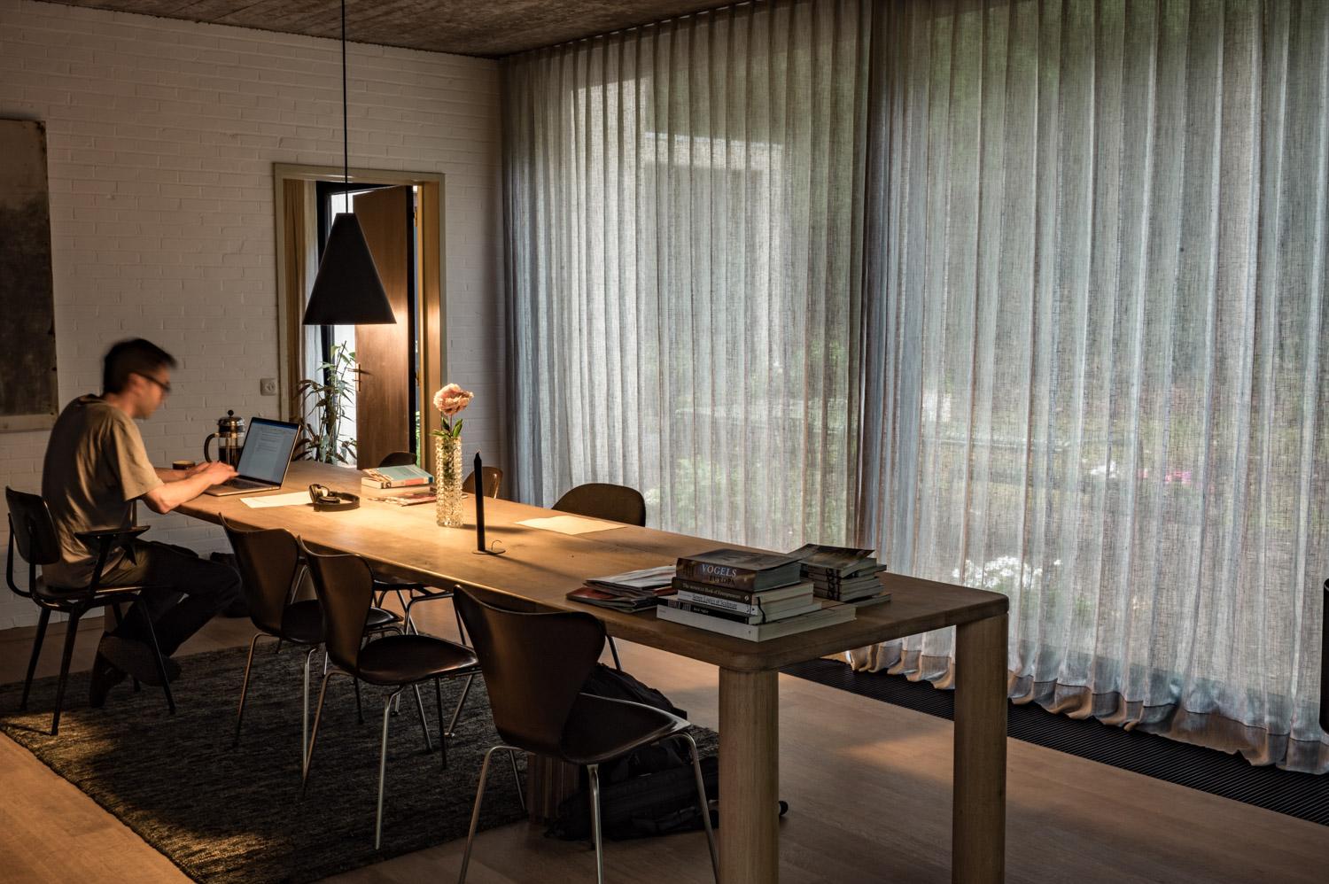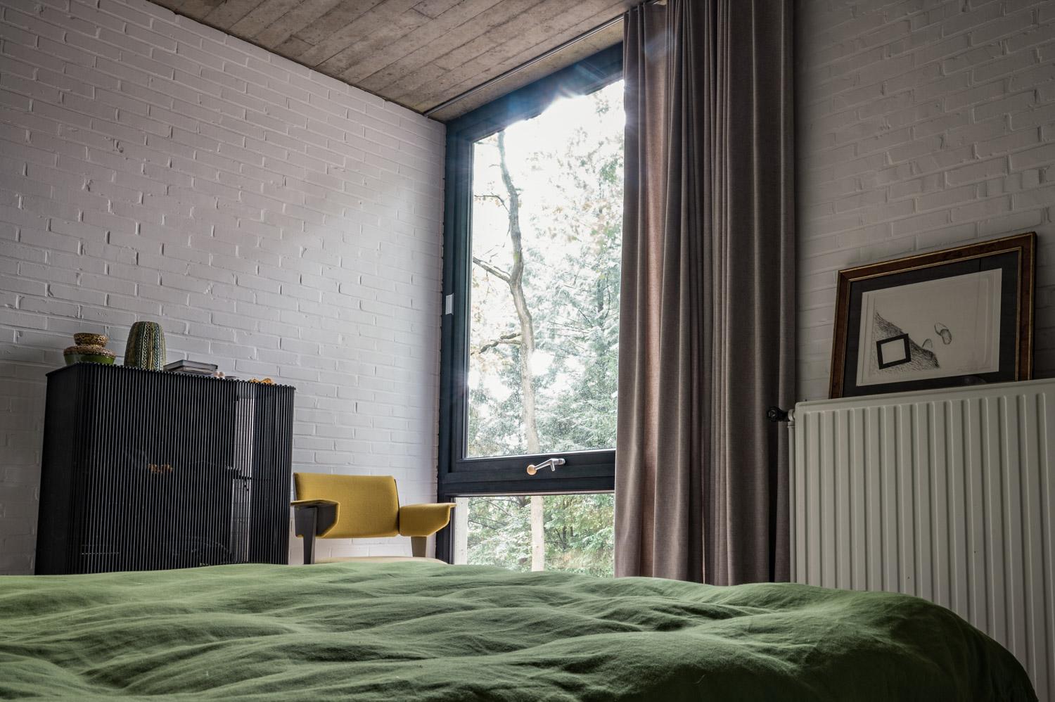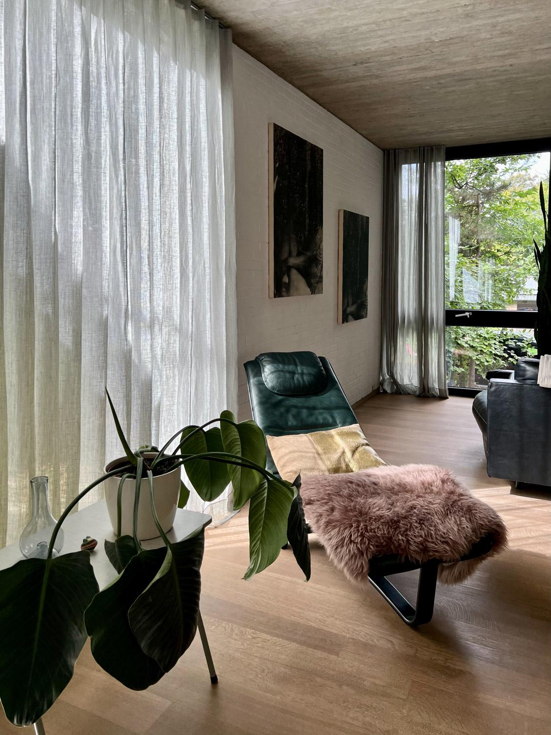 In dit staaltje van rationeel minimalisme, omgeven door groen en bomen, is er een onwaarschijnlijk mooie lichtinval.  De gordijnen in de leefruimte, een linnen-wol mengeling, zijn subtiel aanwezig om zo de oorspronkelijke materialen, die overal terugkomen in de woning, te respecteren.