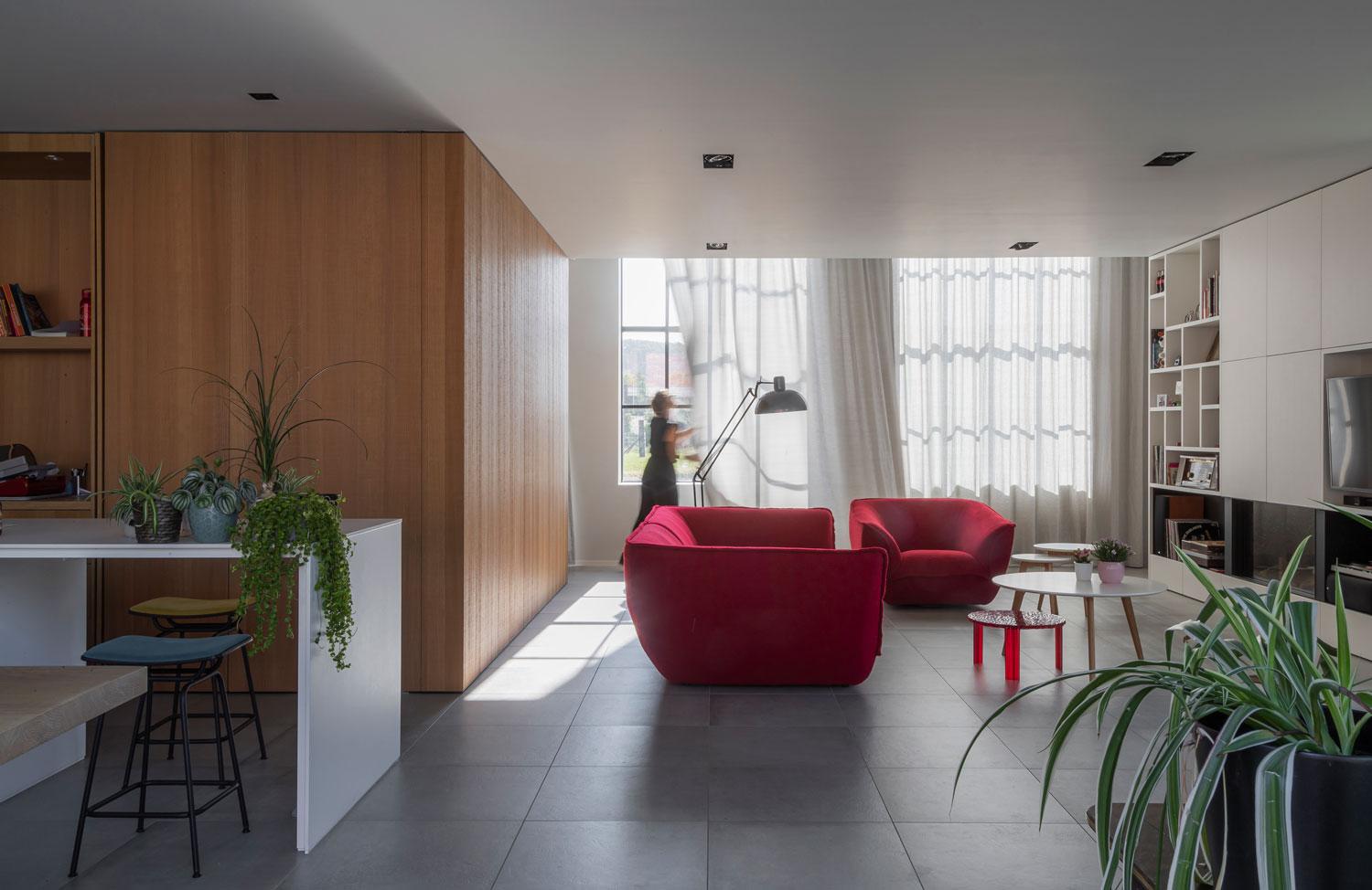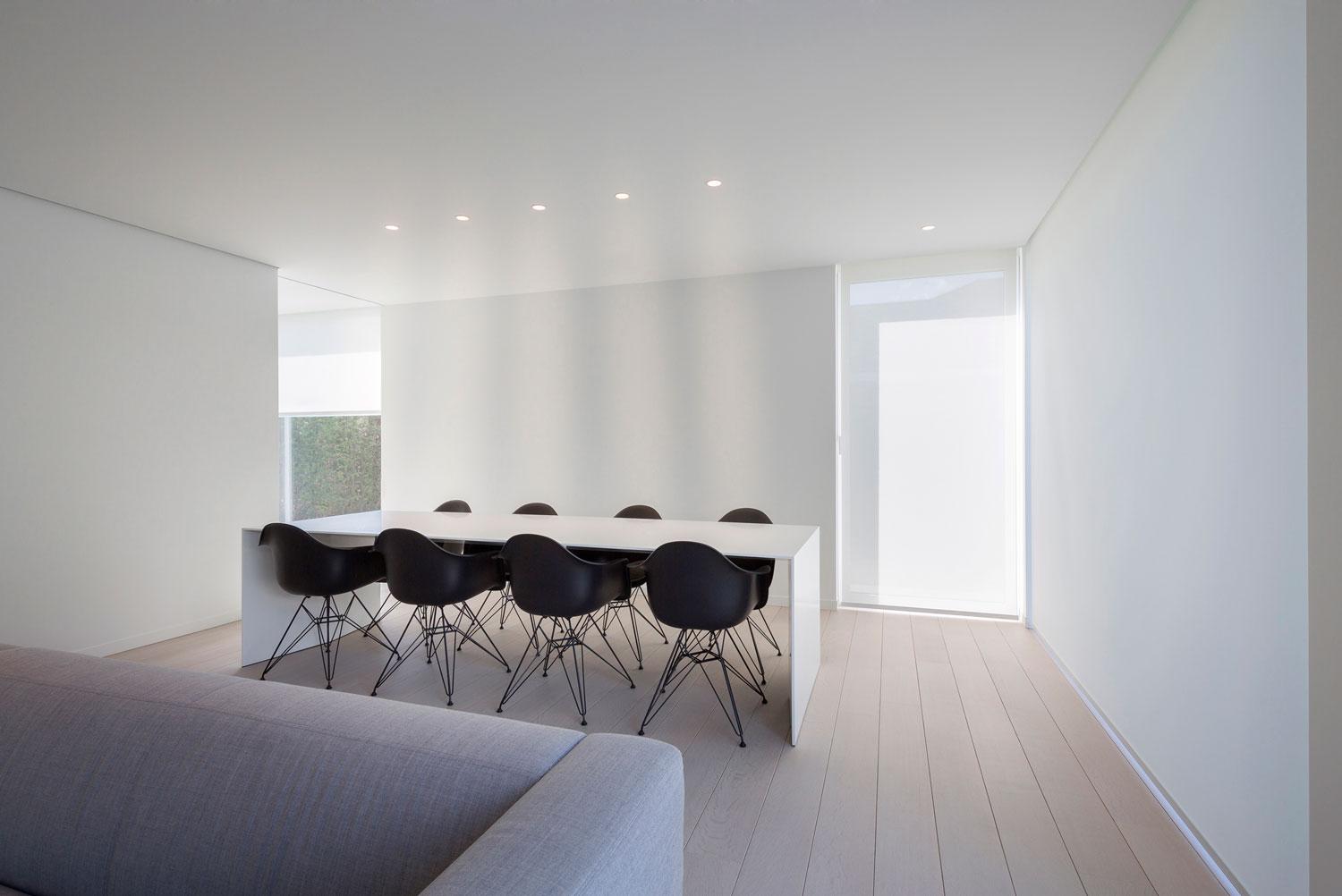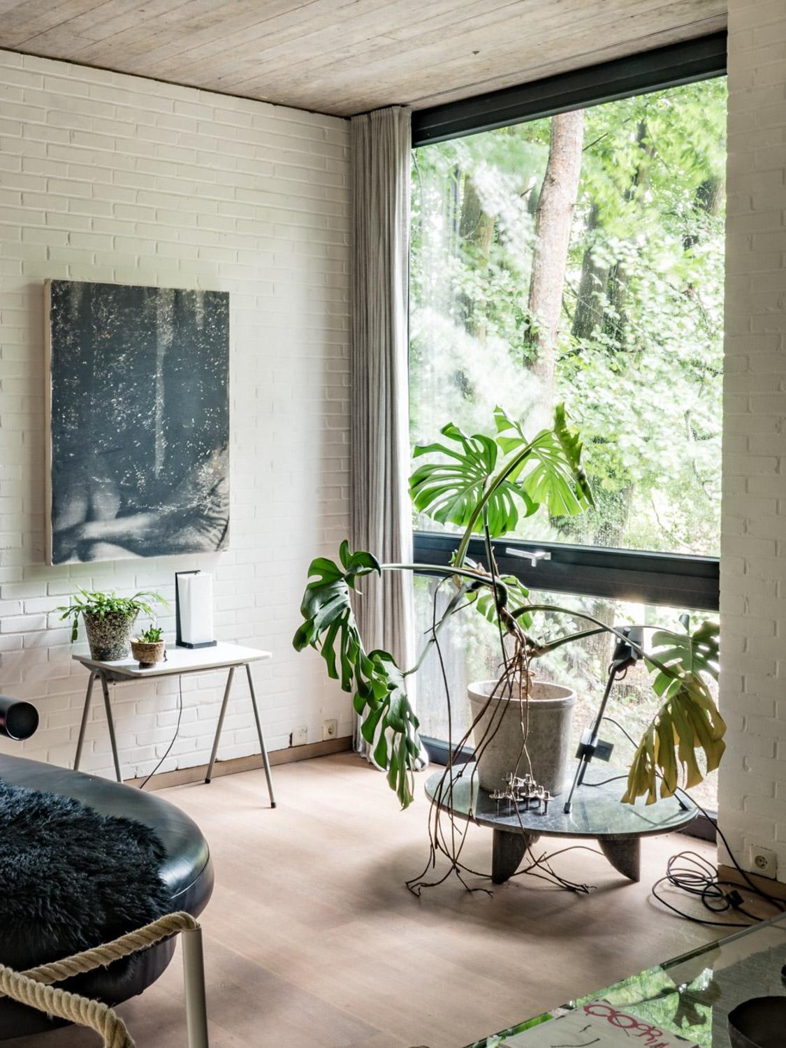 In dit staaltje van rationeel minimalisme, omgeven door groen en bomen, is er een onwaarschijnlijk mooie lichtinval.  De gordijnen in de leefruimte, een linnen-wol mengeling, zijn subtiel aanwezig om zo de oorspronkelijke materialen, die overal terugkomen in de woning, te respecteren.