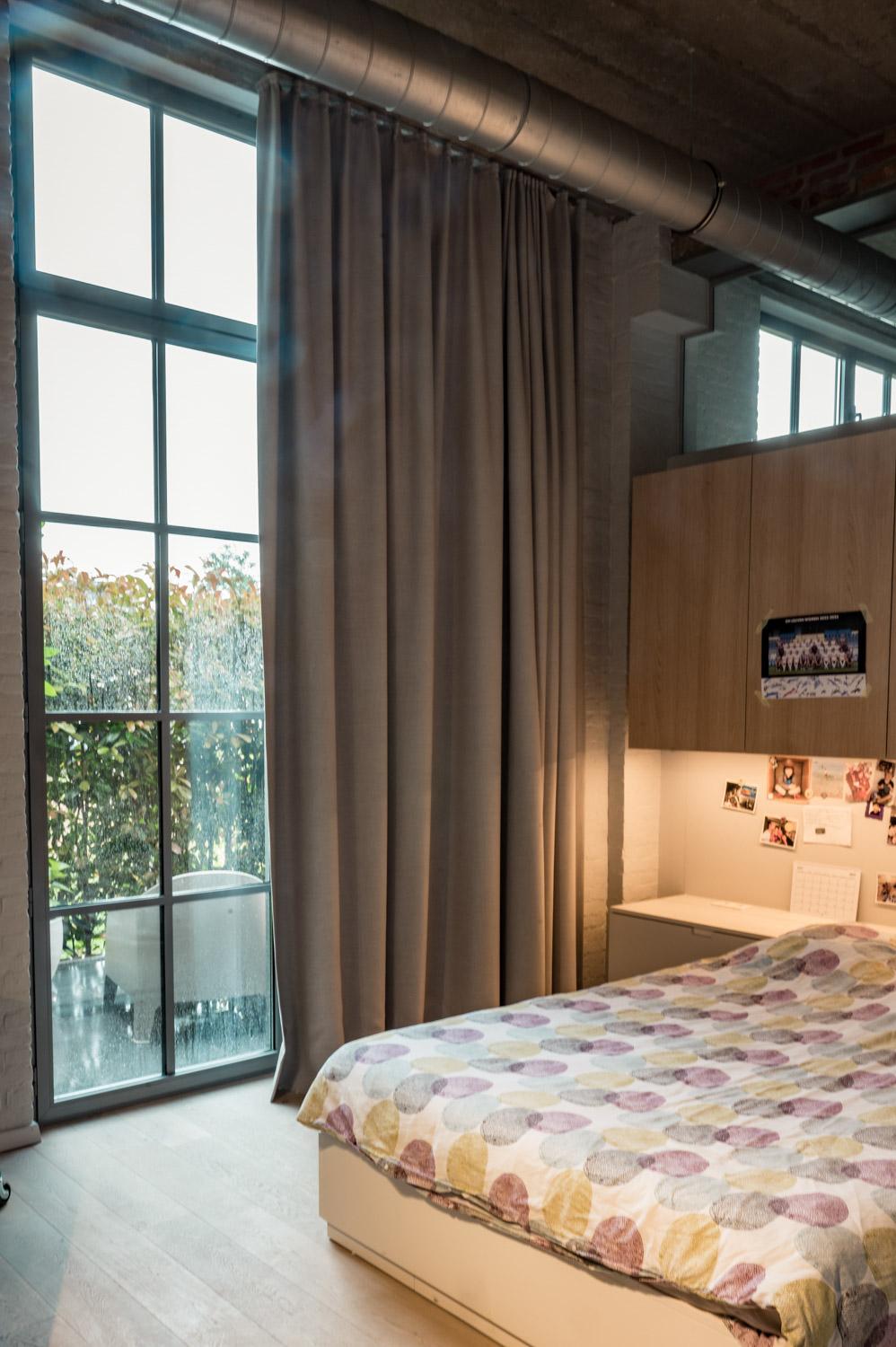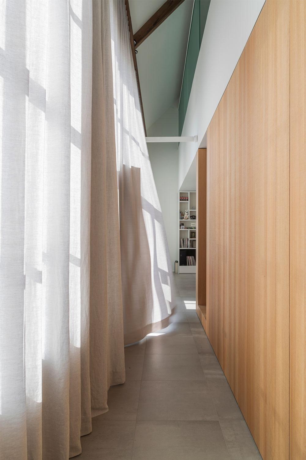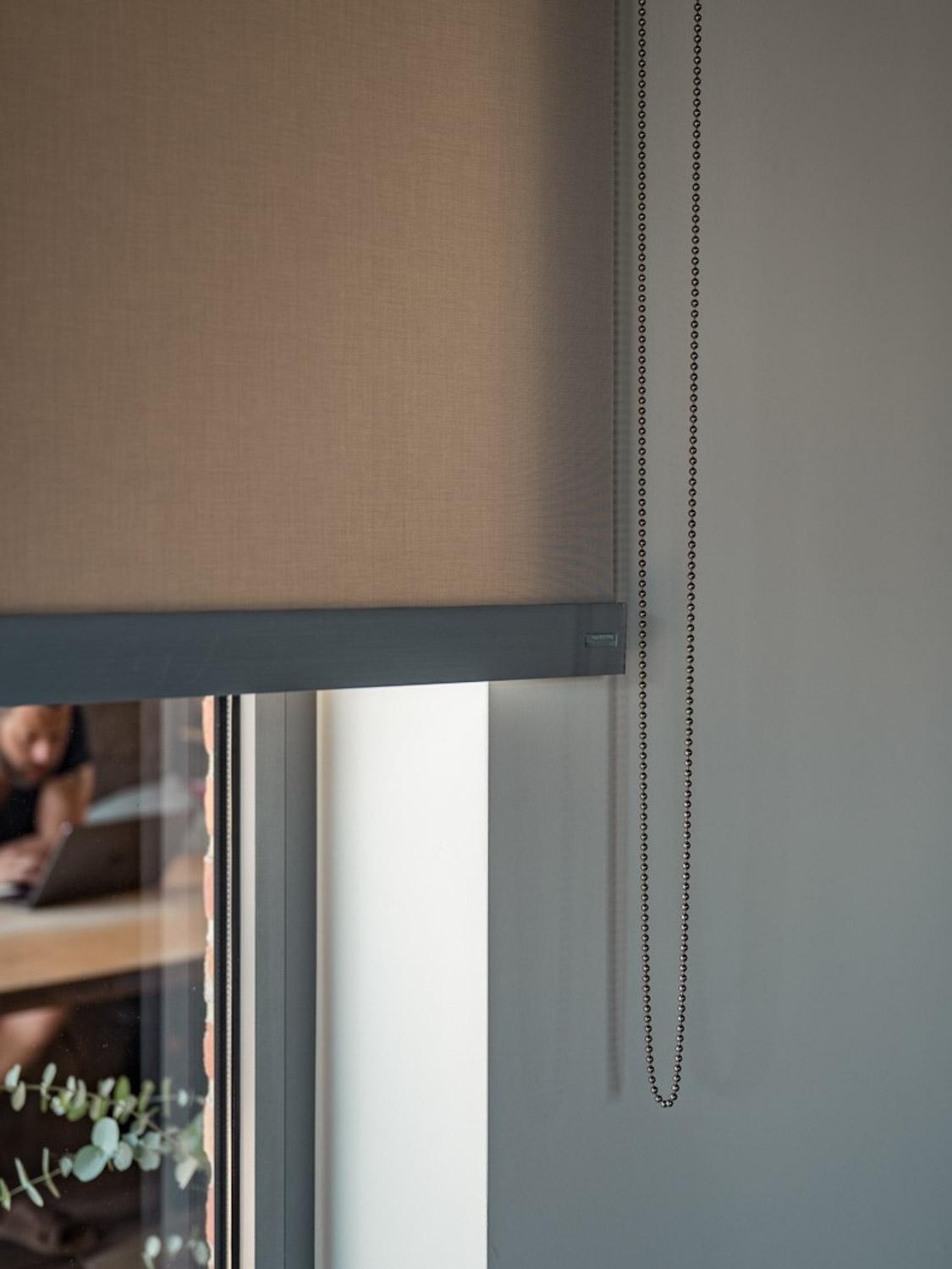 Aan kant van de inkom, met zicht op de ommuurde buitenruimte stellen we een strakkere rolgordijnen voor.  Dit geeft een mooi contrast met de gordijnen en heeft een minder opvallend karakter, ideaal voor dit gedeelte van de loft, deels ook gang naar de slaapkamers.