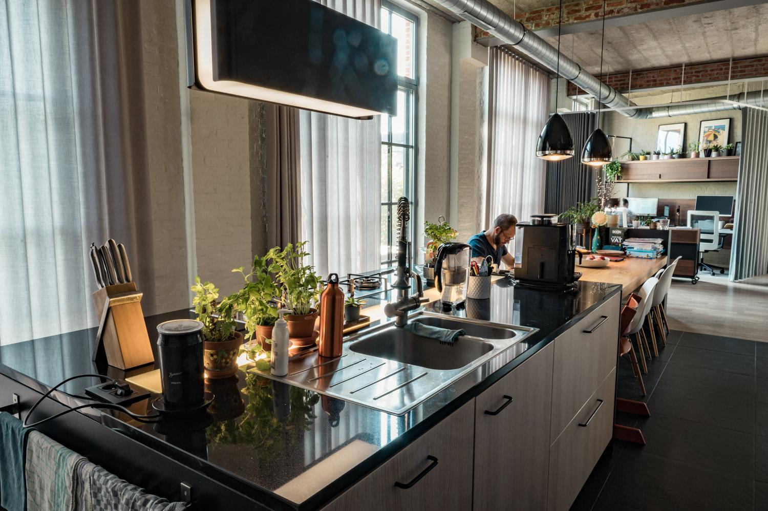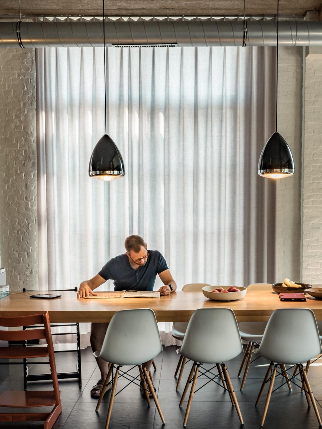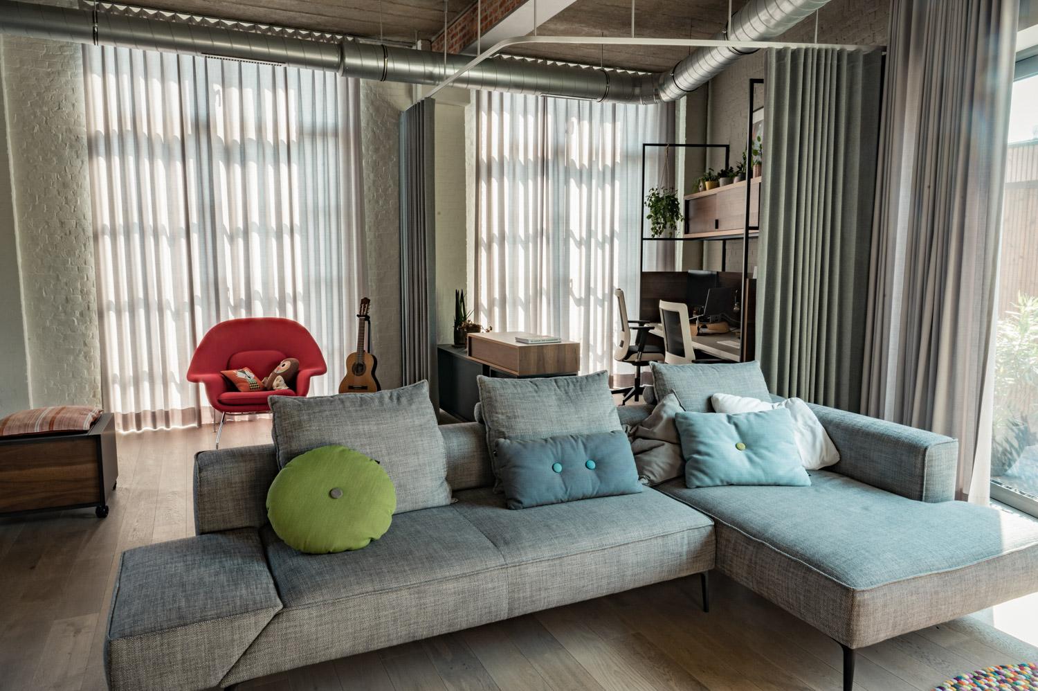 Aan kant van de inkom, met zicht op de ommuurde buitenruimte stellen we een strakkere rolgordijnen voor.  Dit geeft een mooi contrast met de gordijnen en heeft een minder opvallend karakter, ideaal voor dit gedeelte van de loft, deels ook gang naar de slaapkamers.