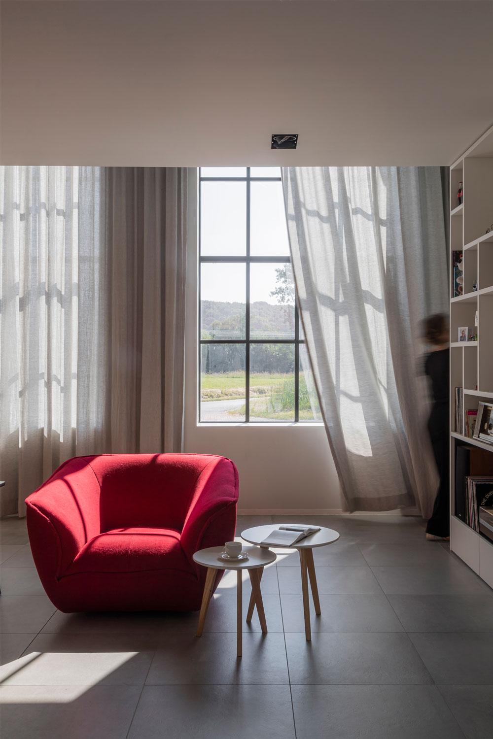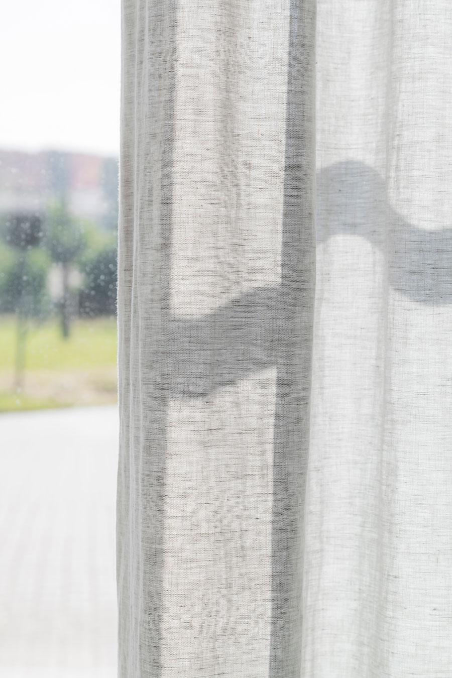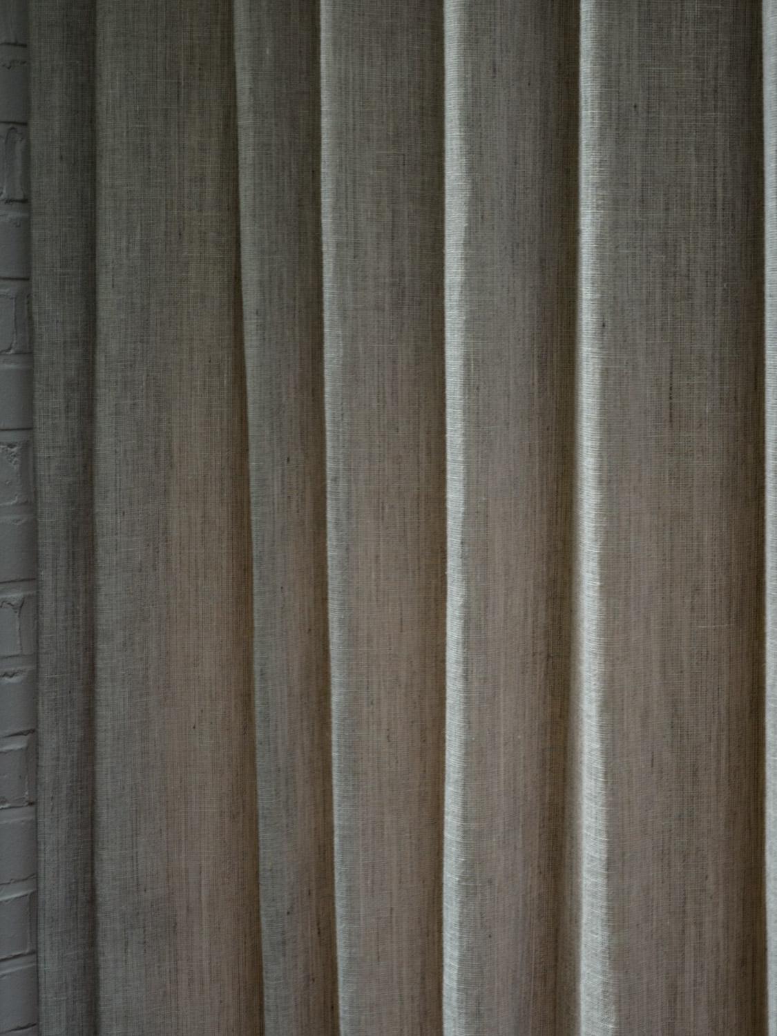 Voor de ramen aan de buitengevel in de leefruimte werd er gekozen voor een gordijn dat qua kleur en gevoel blendt met de tint en textuur van de muren.  De stof is volledig afsluitend maar toch nog lichtdoorlatend.  Zo blijft er, indien gesloten in volle zomer, voldoende licht aanwezig in de leeftruimte, want de lange gevelmuur geeft uit op het zuiden.