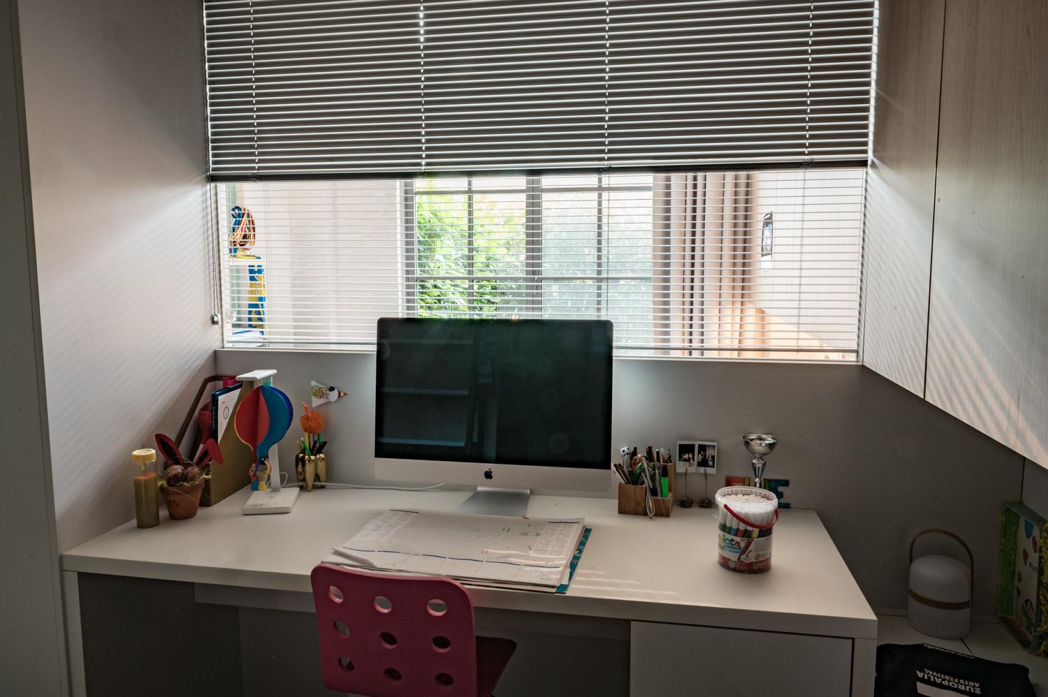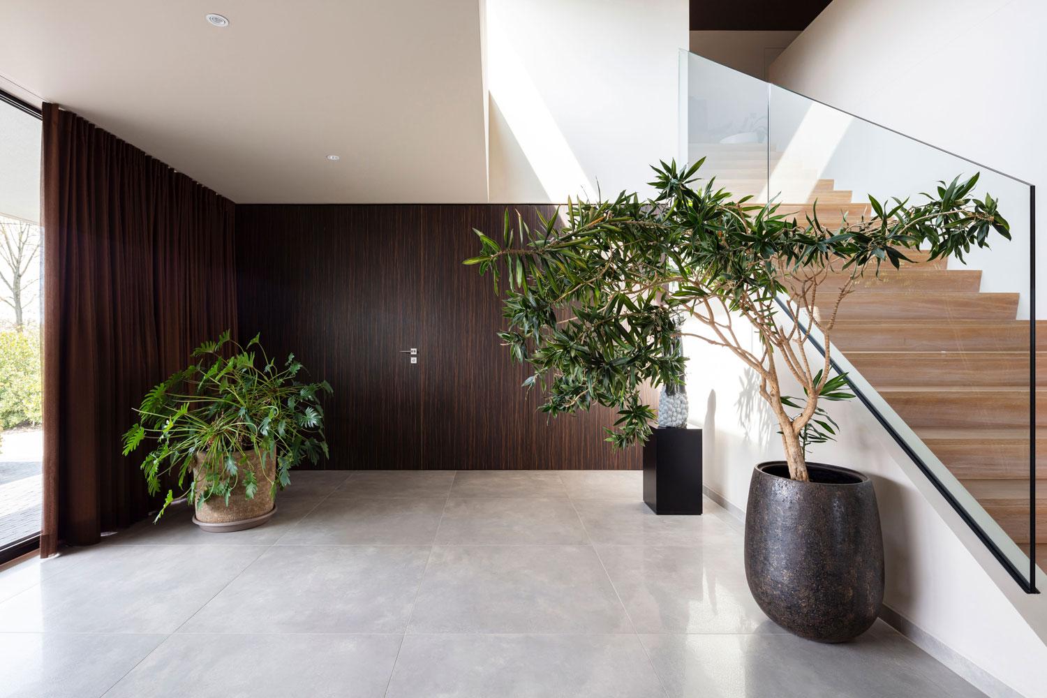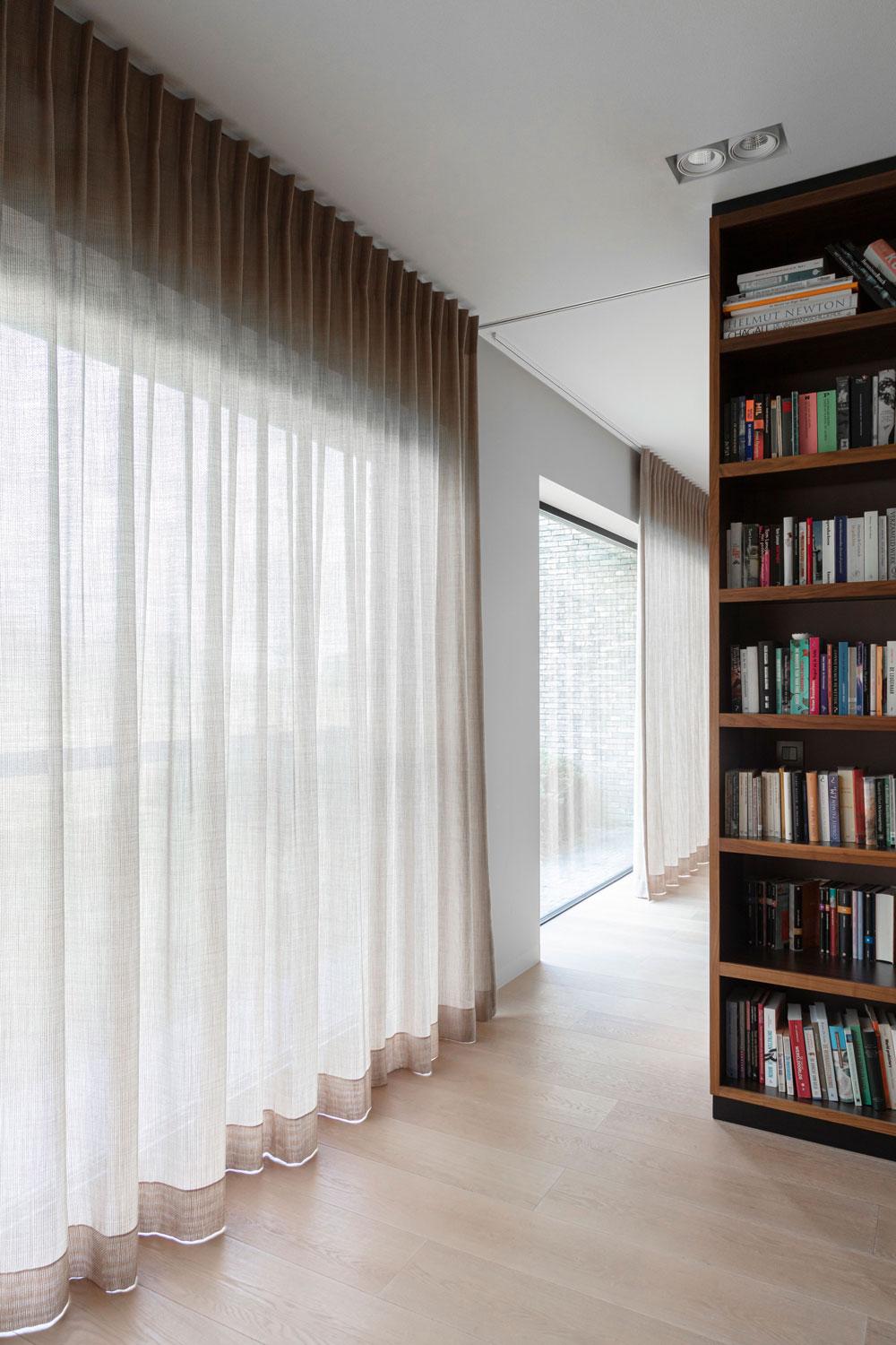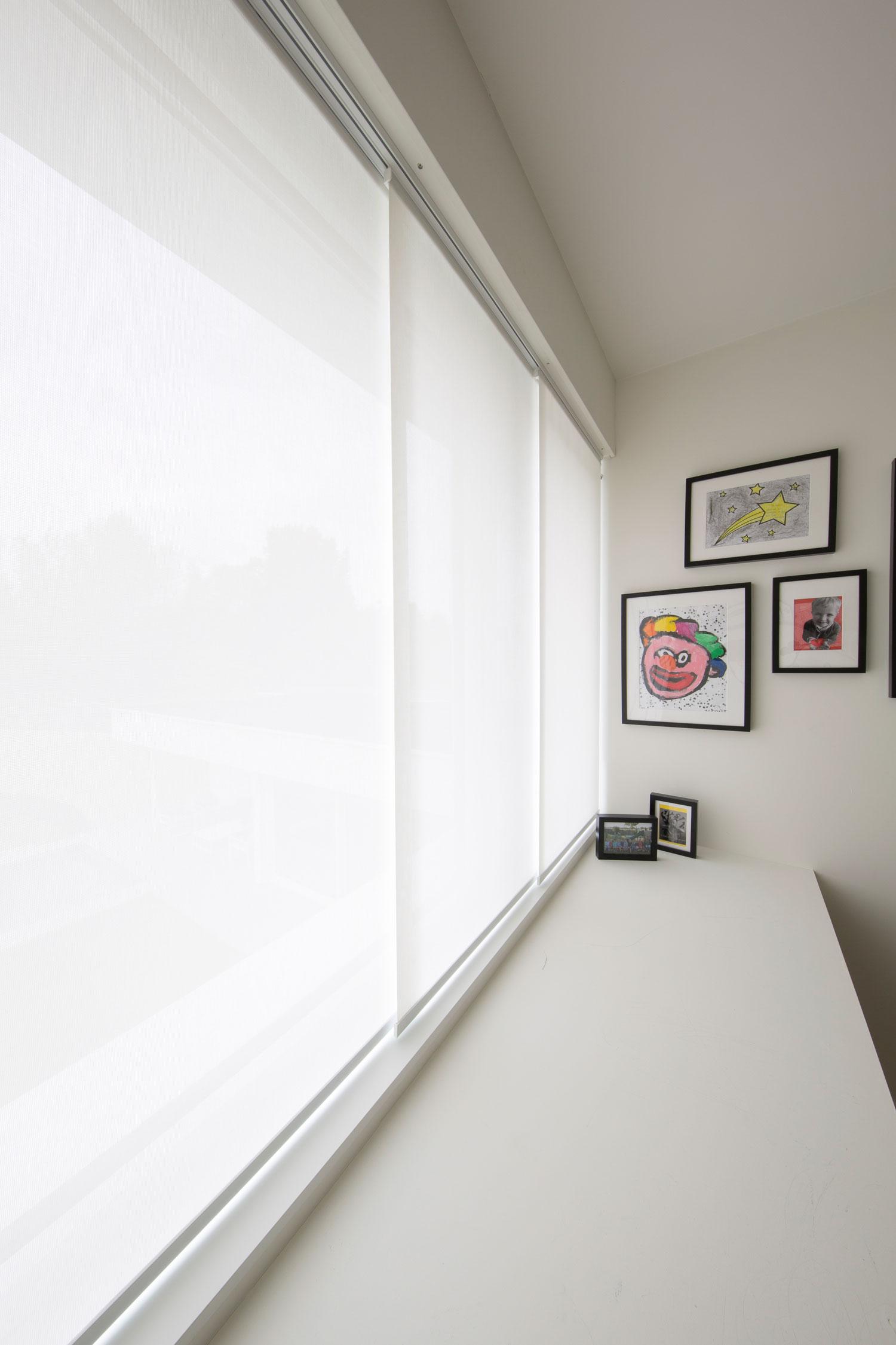 Dankzij onze vroege betrokkenheid, konden alle voorzieningen zoals bv. de inbouwnissen correct gemaakt worden.  We adviseerden witte, zonwerende screendoeken omdat die overlopen in het kleur van de muren en zo een rustig en strak gevoel geven. Op de bovenverdieping werd geopteerd voor dezelfde screendoeken in japanse schuifpanelen. Zo is er over de verdiepingen heen een uniforme look en feel gecreëerd.