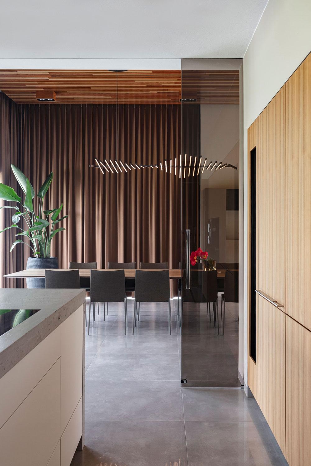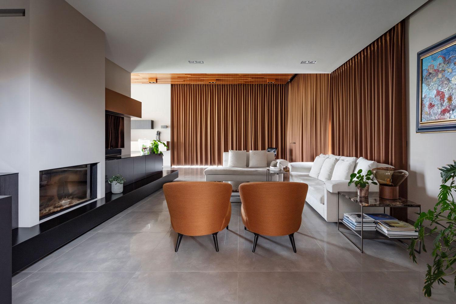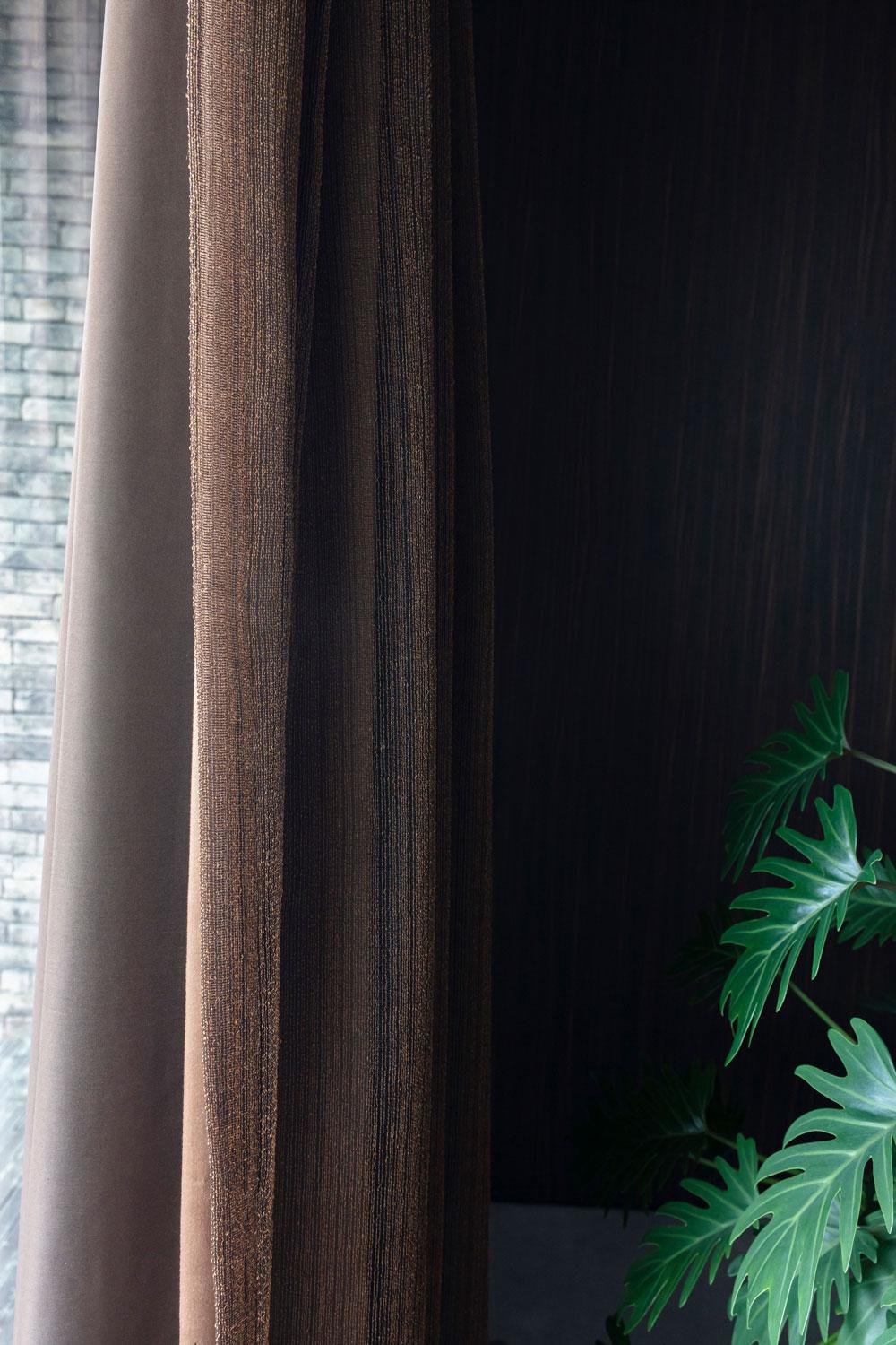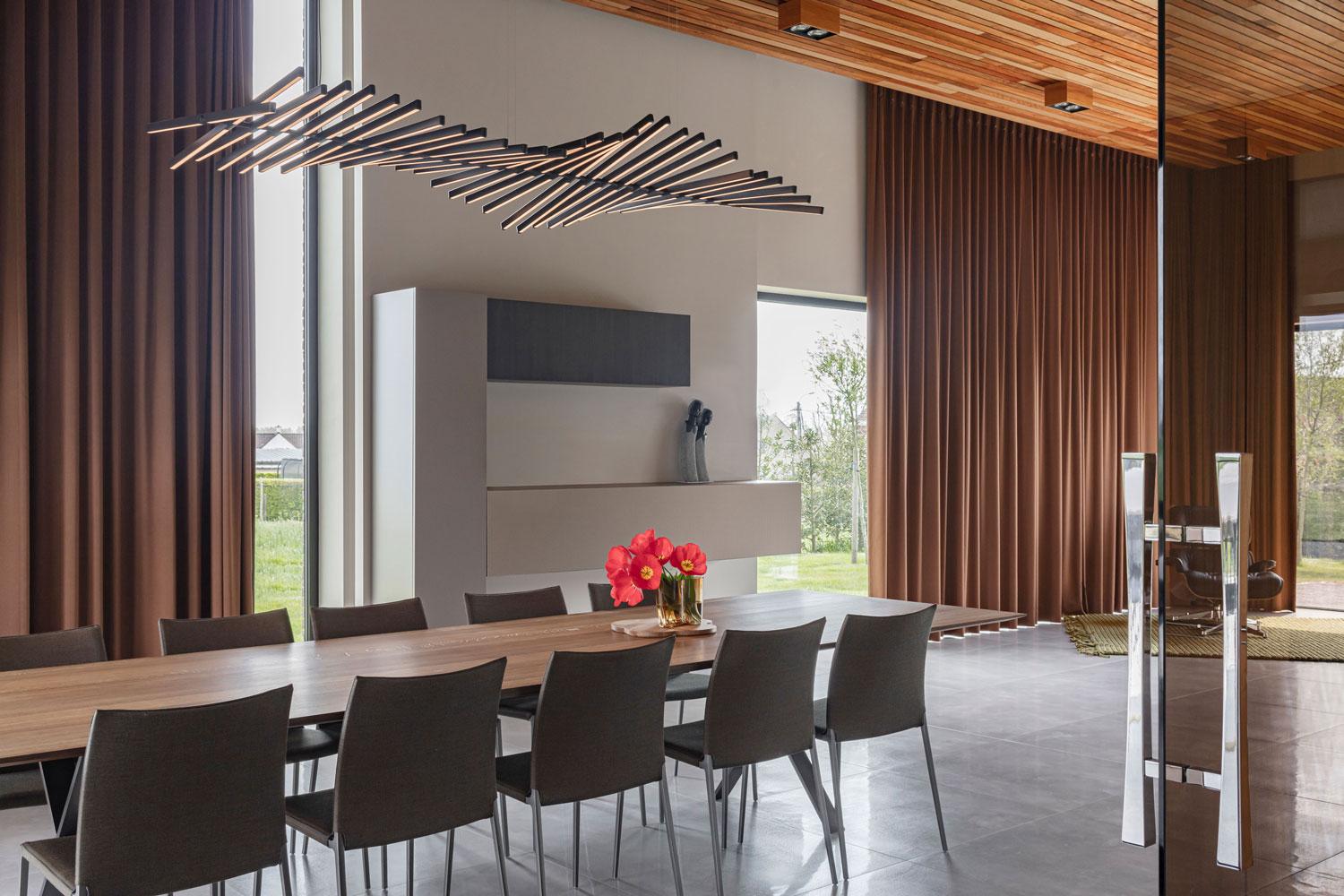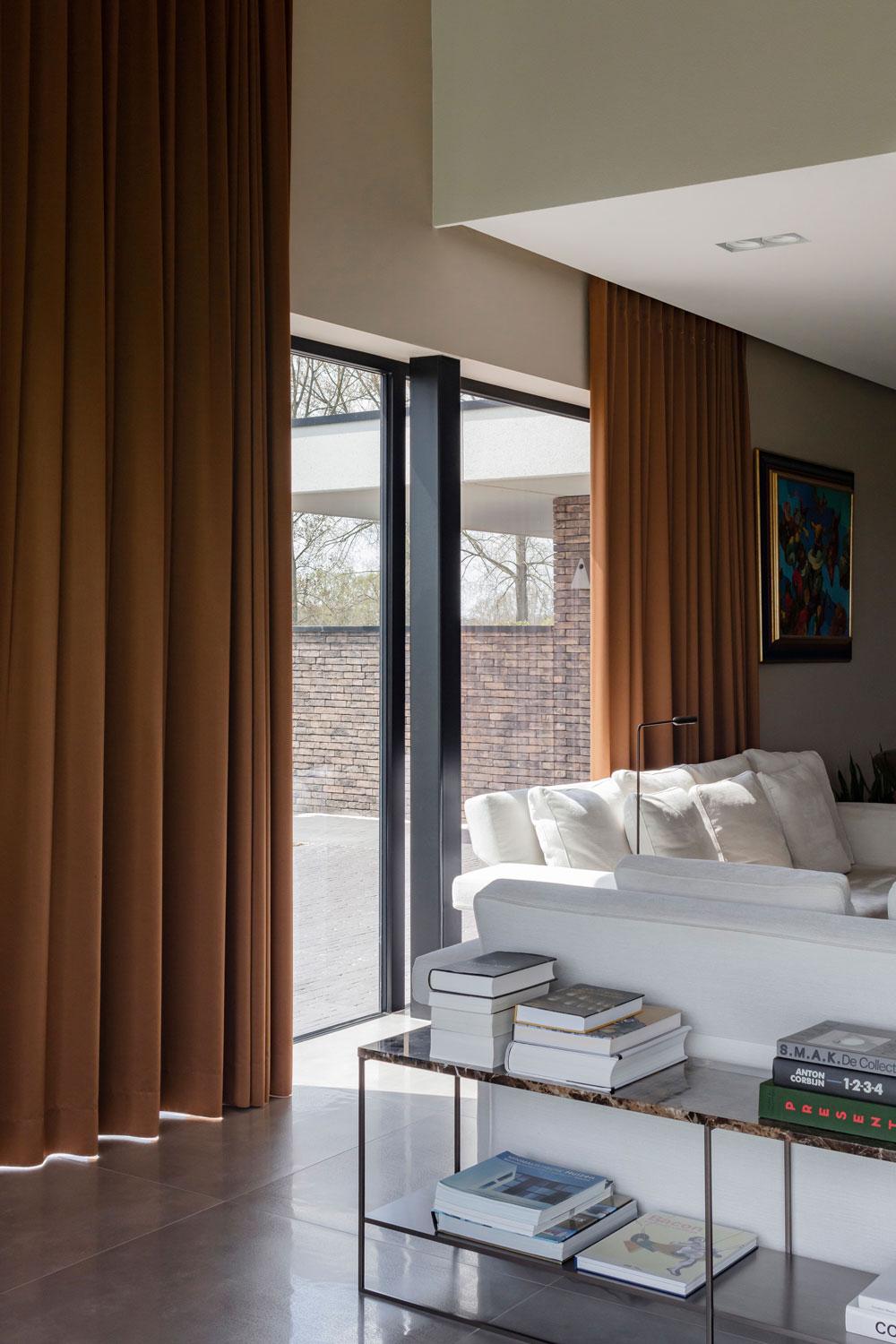 De grote raampartijen  zowel in breedte als hoogte, kregen klassieke overgordijnen in warme koperkleur passend met het hout.  Door de volumes was dit het element om voldoende warmte en gezelligheid in de woning te bekomen.