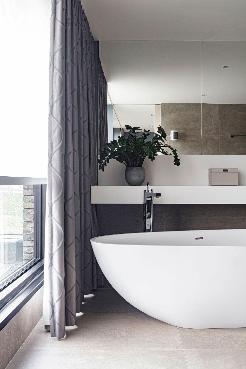 Door de vierkante plafondrail van het raam aan de voorkant te laten doorlopen via een verbuiging langs de badruimte kan het gordijn deze perfect afsluiten indien gewenst.