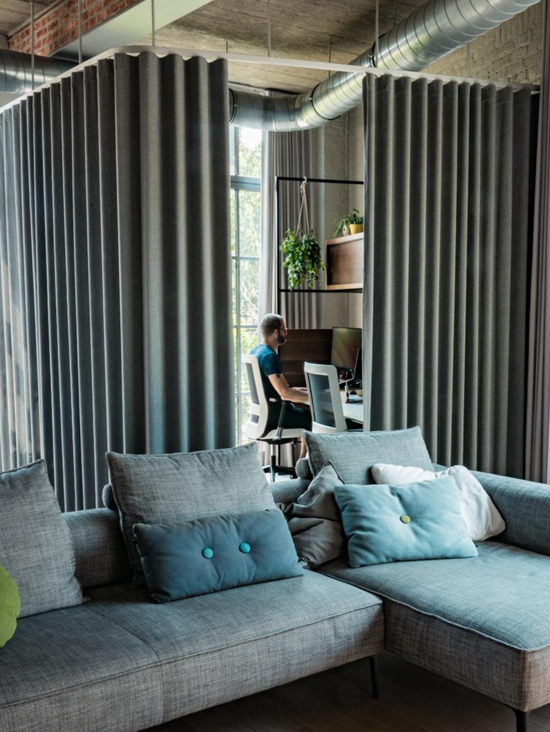 Om rustiger te kunnen werken zochten we een oplossing om de workspace af te sluiten.  Een rail op pendels was nodig om het gordijn onder de bestaande technische structuren te laten schuiven.  De zware stof zorgt voor voldoende geluidsdemping.