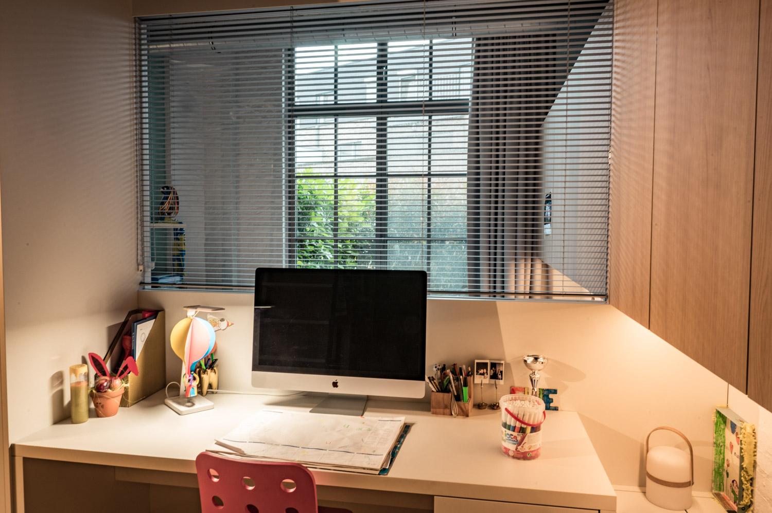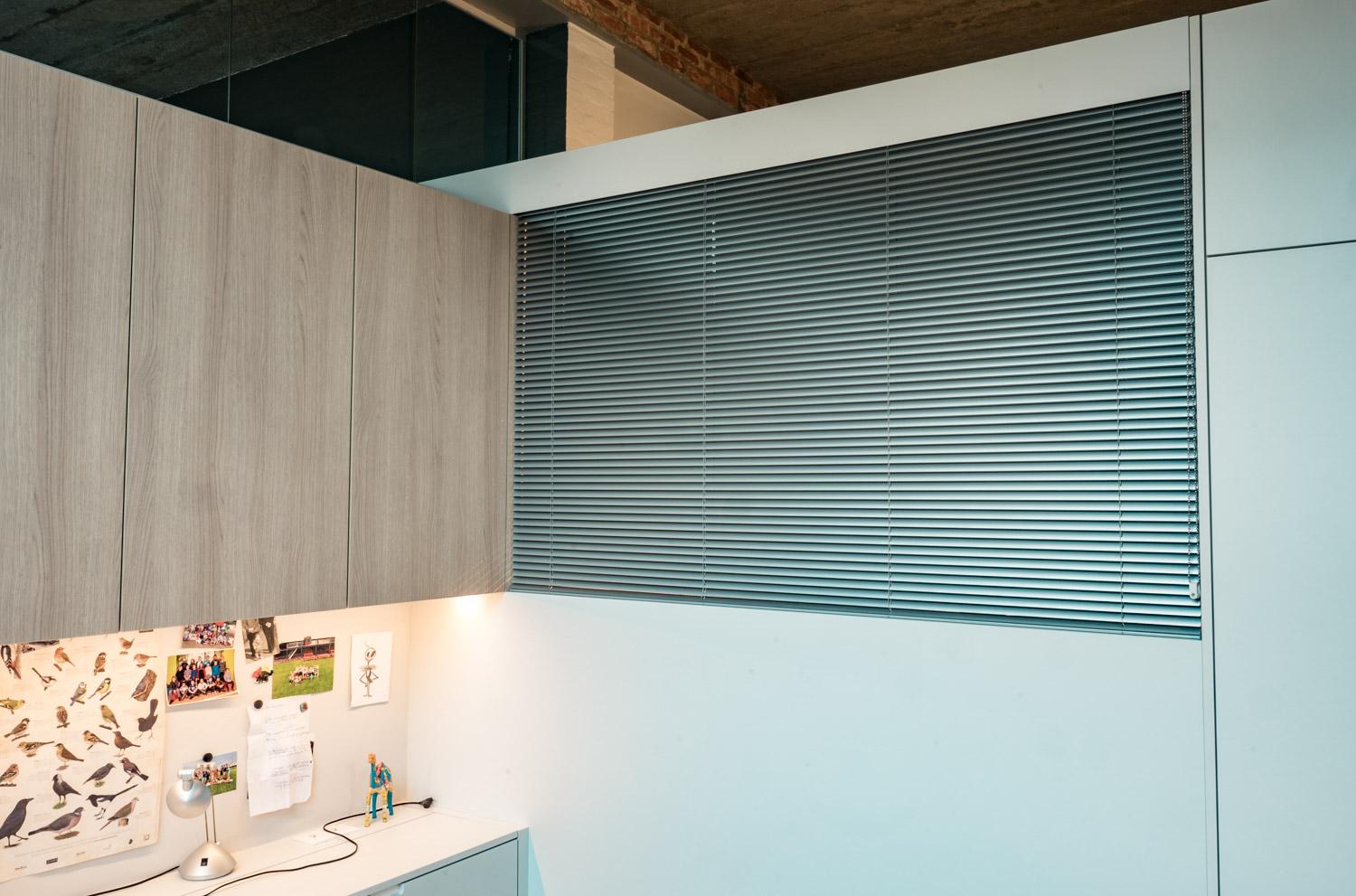 Door de neutrale kleur hier en de montage in de dagkant van de ramen, blijft de vormgeving strak, terwijl de horizontale lijnen toch zorgen voor een speels accent.