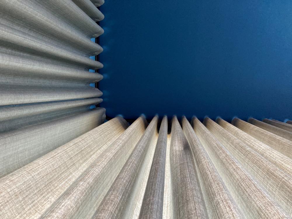 Het overgordijn is aan de 2 kanten zichtbaar en verschillend van textuur.  De kant naar de slaapkamer heeft de look en feel van een wollen kwaliteit.  De subtiele tint van blauw in de weving past heel goed met het blauw geschilderde plafond.  De stof is volledig afsluitend maar toch nog lichtdoorlatend. De andere (achter)kant van de stof heeft een bruinere tint met een verticaal lijnmotief, die dan met de natuurlijke tinten van de badkamer mooi samenvalt.