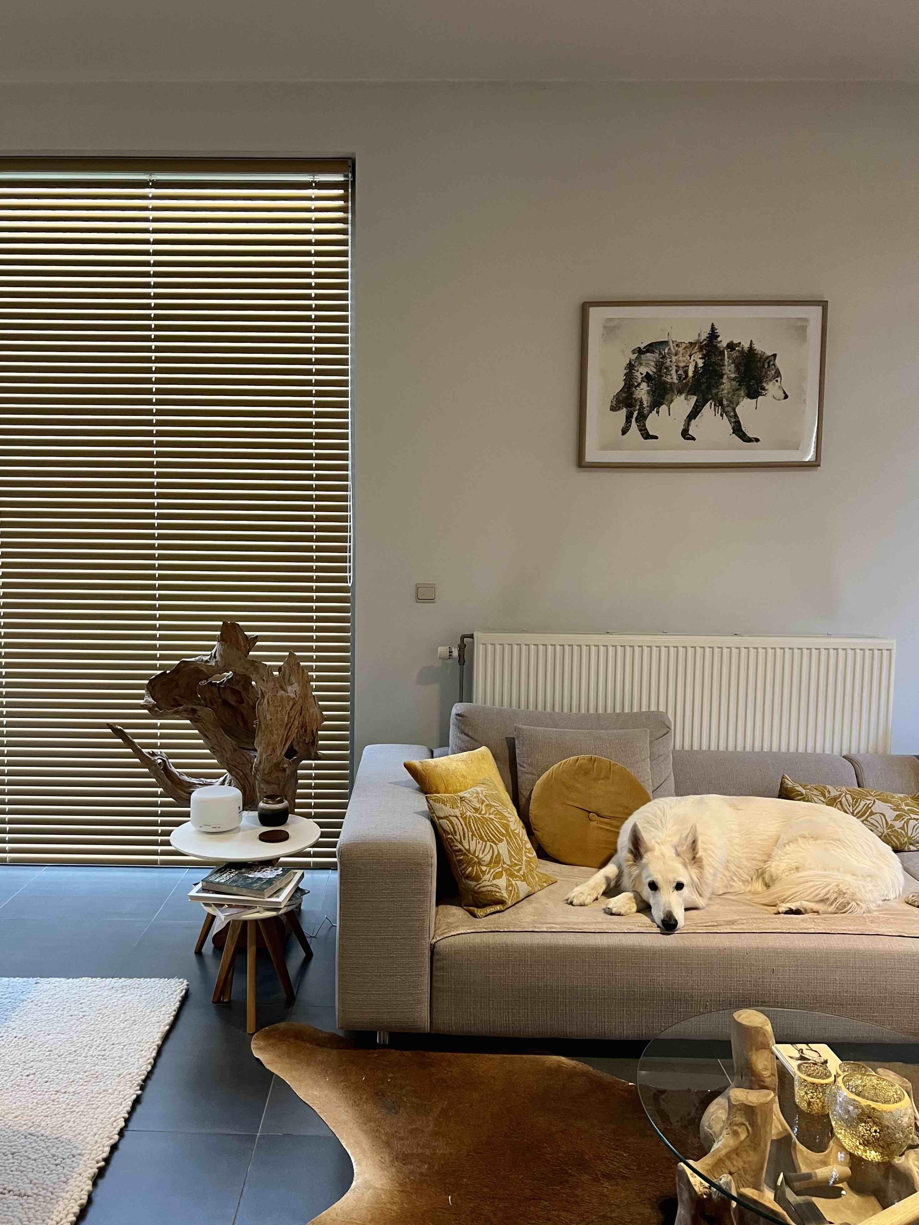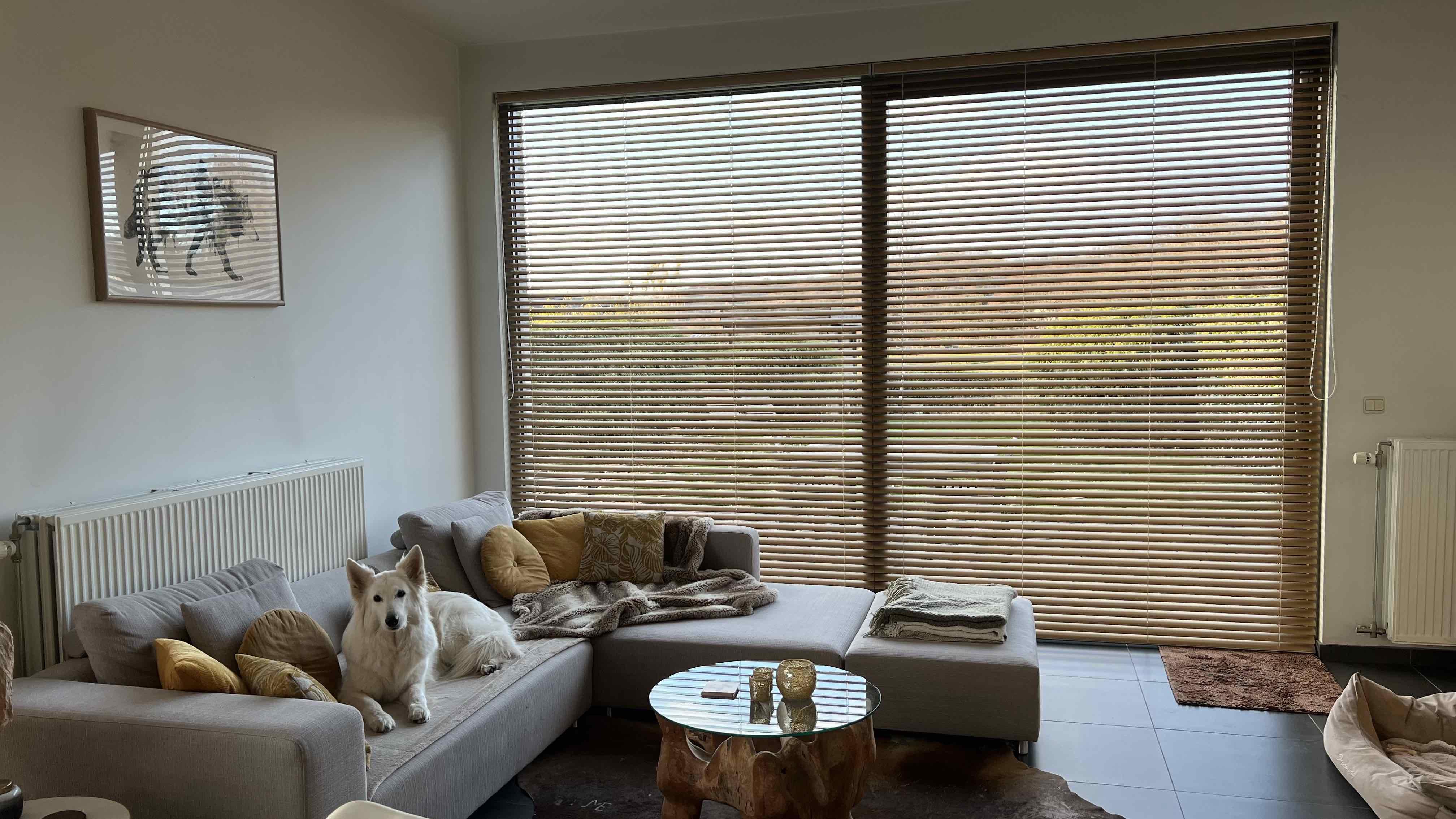 Daarom stelden we een mat goud bronzen tint in 50mm aluminium voor.  De kleur geeft een mooie gloed aan het interieur.  De bredere lamellen passen qua verhouding beter bij het raam.  De kettingbediening zorgt dan weer voor een vlotte bediening.
