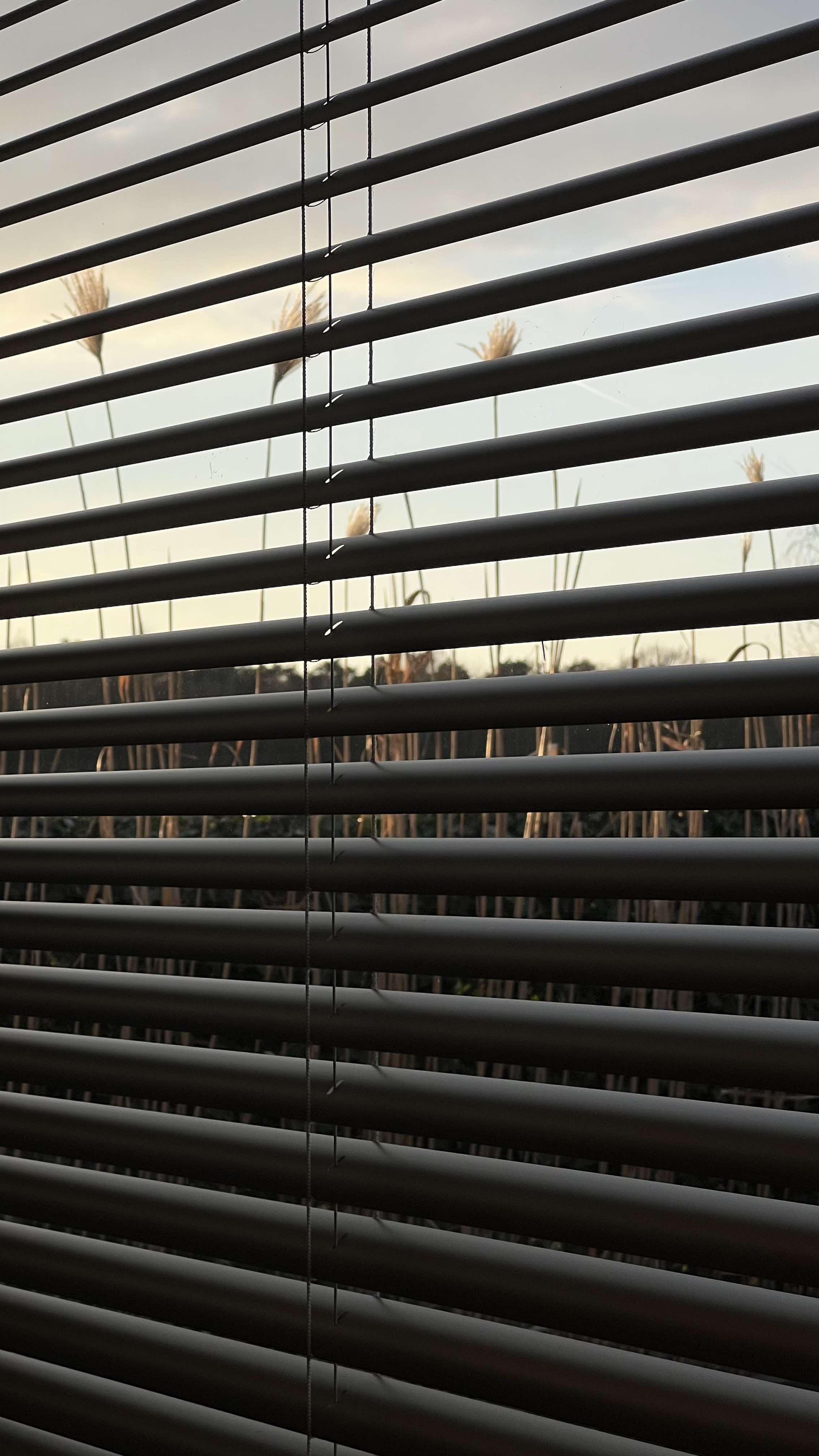 Vroeger hingen er smalle 25mm lamellen in een koel grijze tint.  We wilden wel een andere sfeer creëren door andere lamelbreedte en gans andere kleur.
