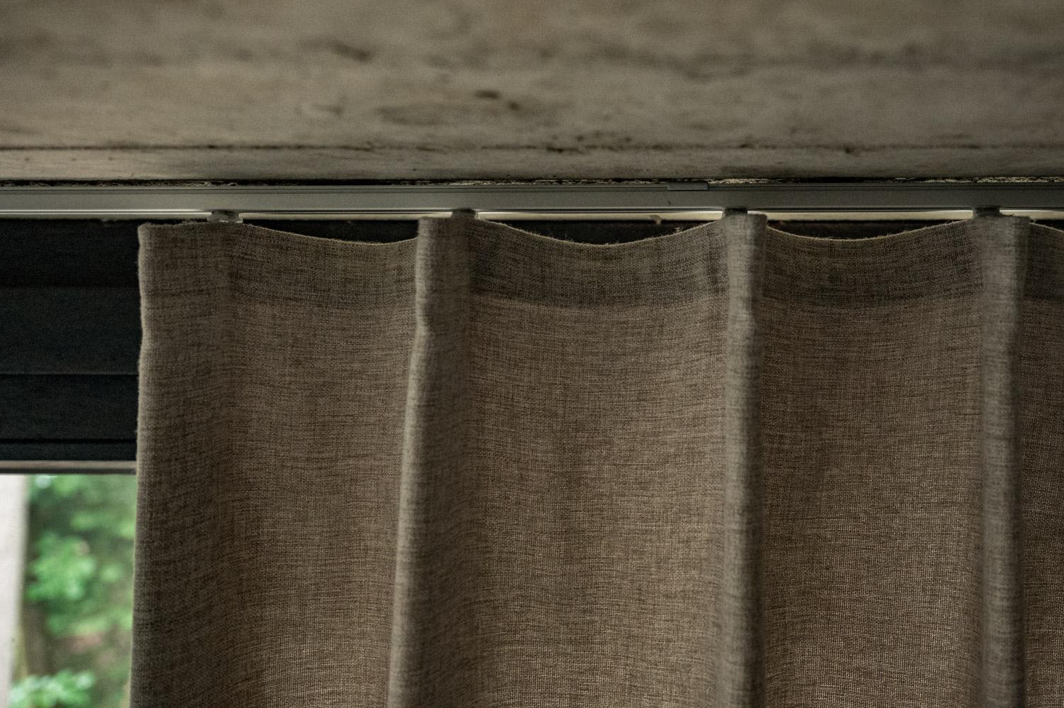 Een bijzonder goed glijdende  gordijnrail voor grote oppervlakten  werd ingewerkt in een massieve houten balk. Een goede coördinatie tussen architect, timmerman en onszelf hebben dit tot een mooi warm eindresultaat gebracht.