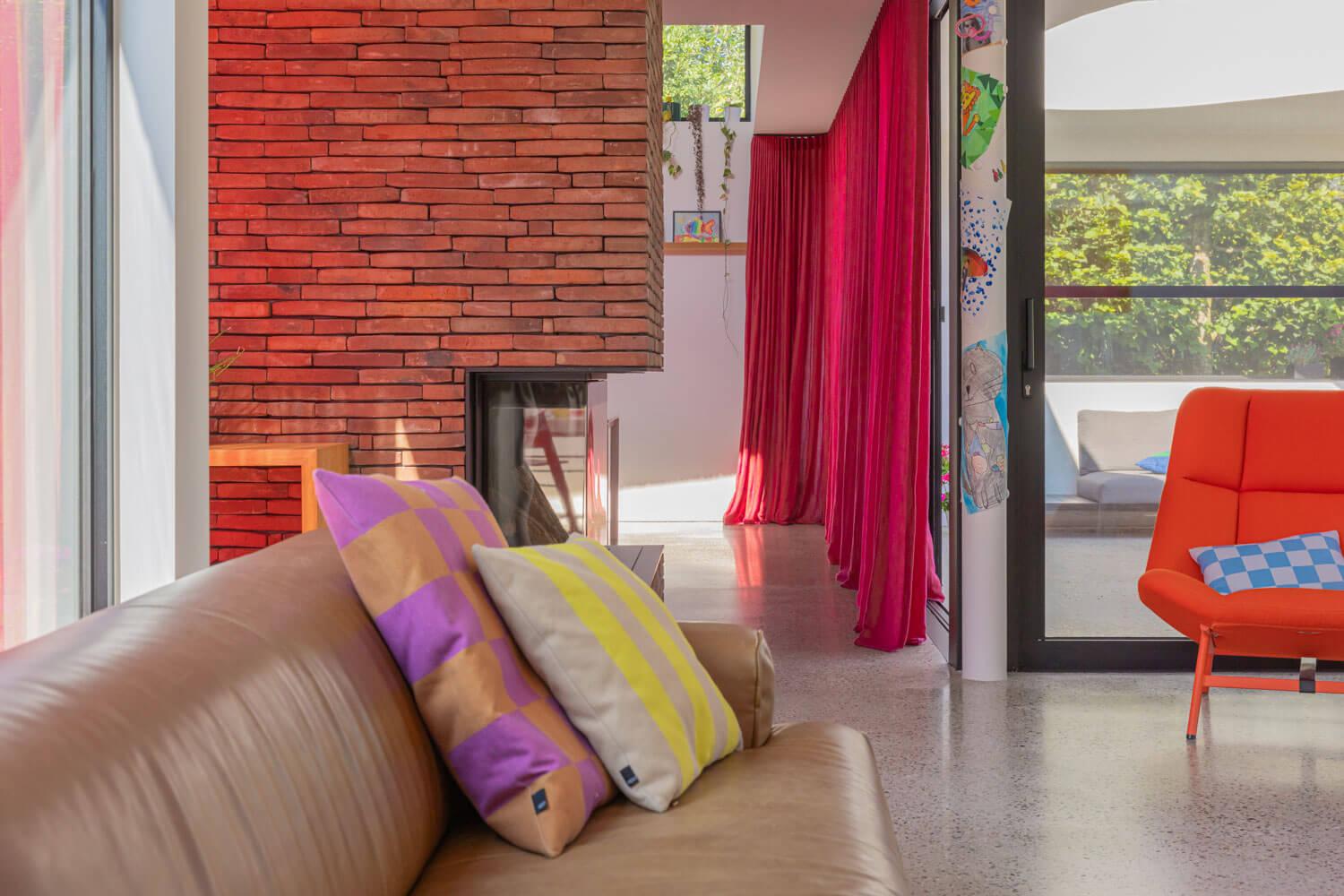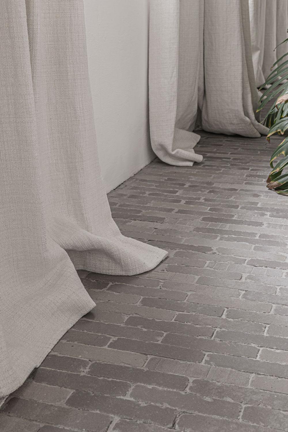 Er werden materialen gekozen die leven en ademen, zoals linnen, kleiklinkers en bamboevezels. De ramen kregen een aankleding die past bij het brutalistische karakter van de ruimte, met ruwe texturen en natuurlijke vezels. Zware linnen overgordijnen bieden privacy en akoestische demping, met een handmatig aangebrachte verf voor een unieke uitstraling.