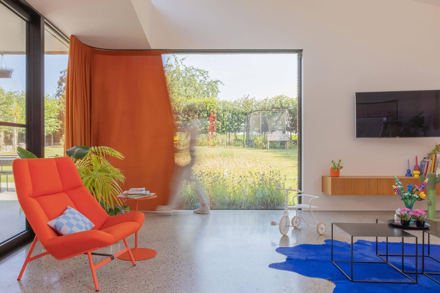 In de leefruimte heb je het gevoel ‘buiten’ te zitten door de grote raampartij. Het gordijn wordt hier een deel van het interieur en vormt een mooie 2de huid indien gesloten. Bij de keuze ervan was het belangrijk dat het contact met de omgeving behouden bleef.