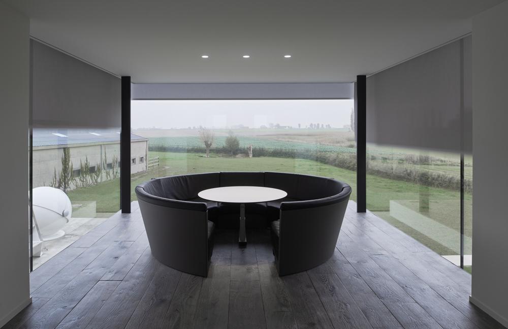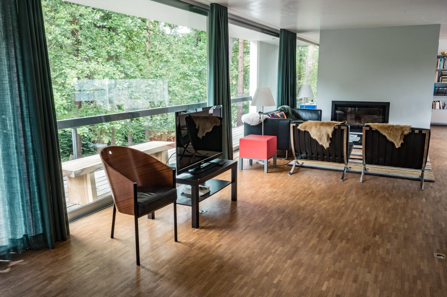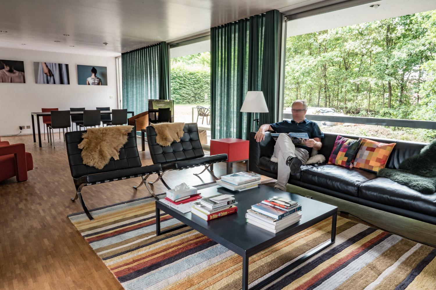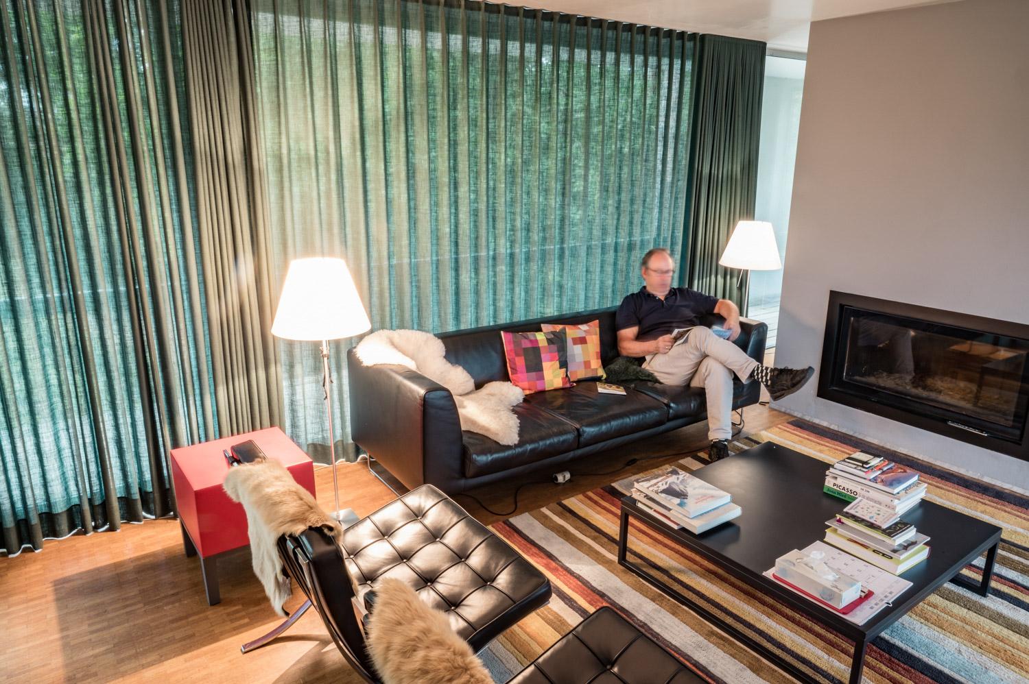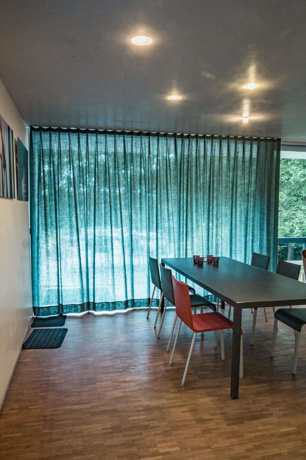 In de leefruimte heb je het gevoel ‘buiten’ te zitten door de grote raampartij. Het gordijn wordt hier een deel van het interieur en vormt een mooie 2de huid indien gesloten. Bij de keuze ervan was het belangrijk dat het contact met de omgeving behouden bleef.