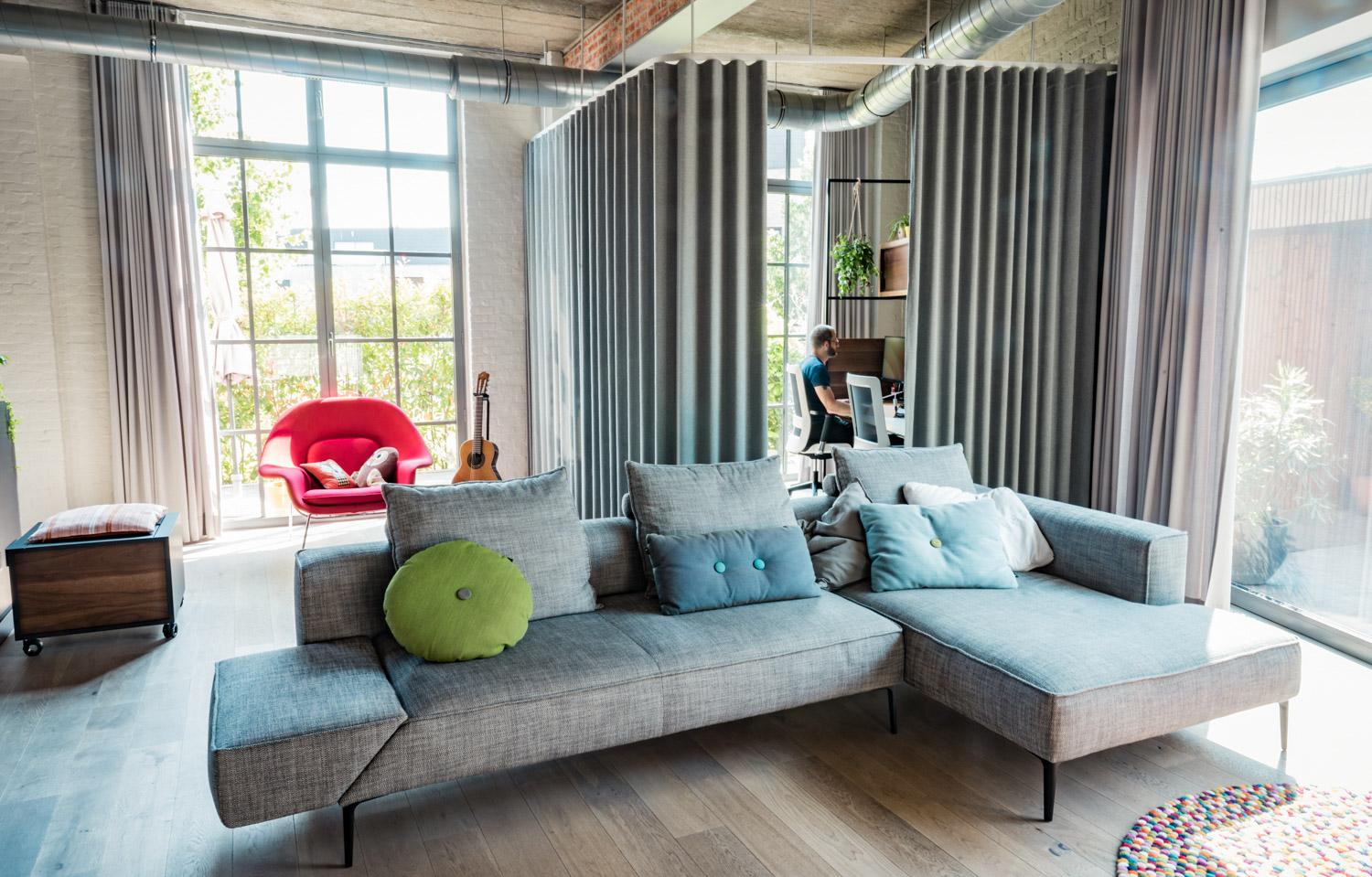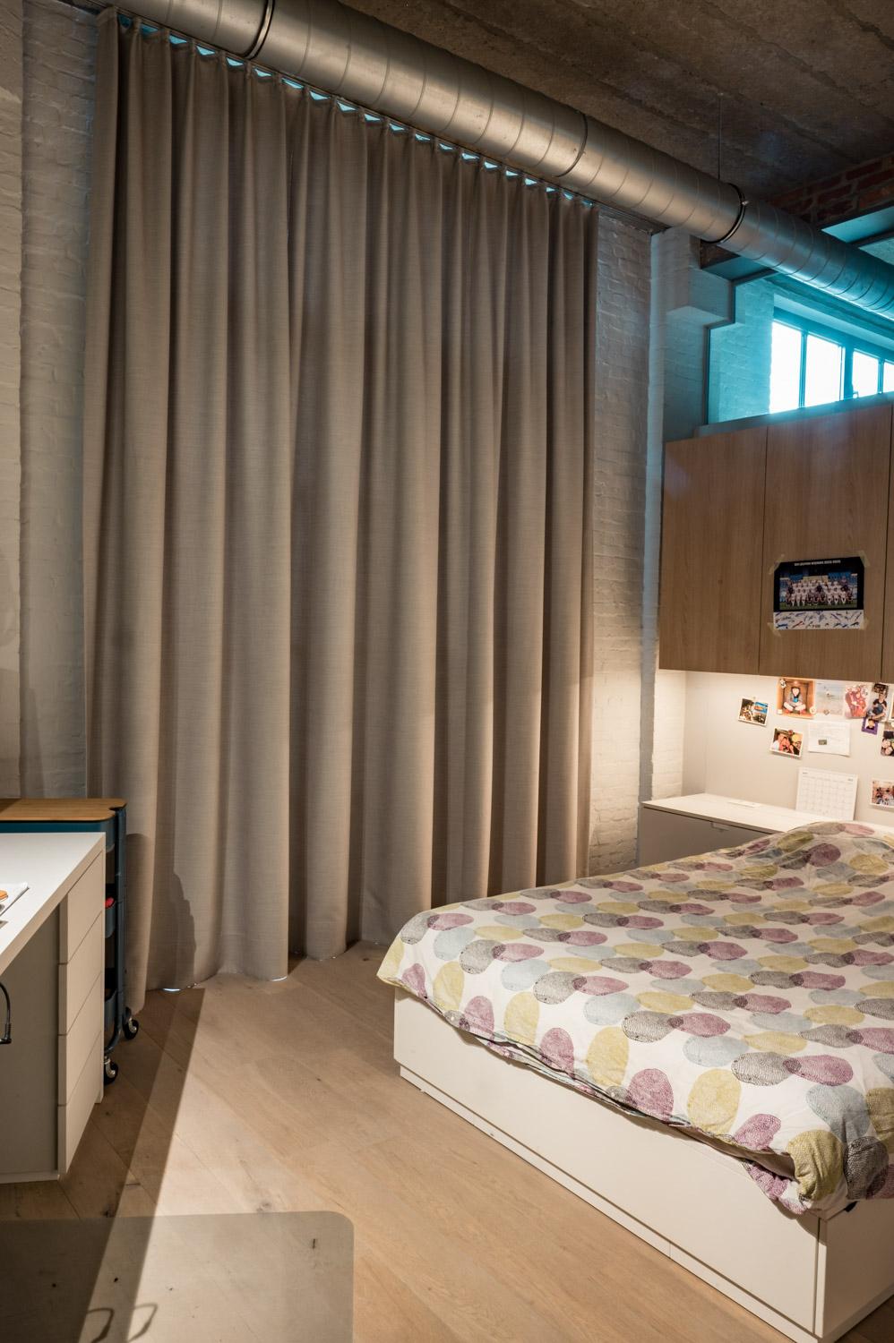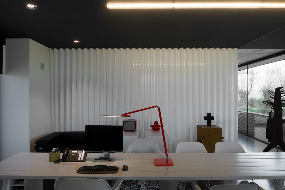 Om rustiger te kunnen werken zochten we een oplossing om de workspace af te sluiten. Een rail op pendels was nodig om het gordijn onder de bestaande technische structuren te laten schuiven. De zware stof zorgt voor voldoende geluidsdemping.