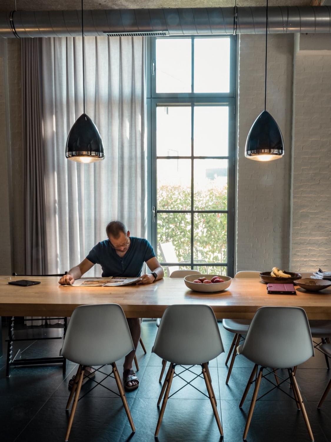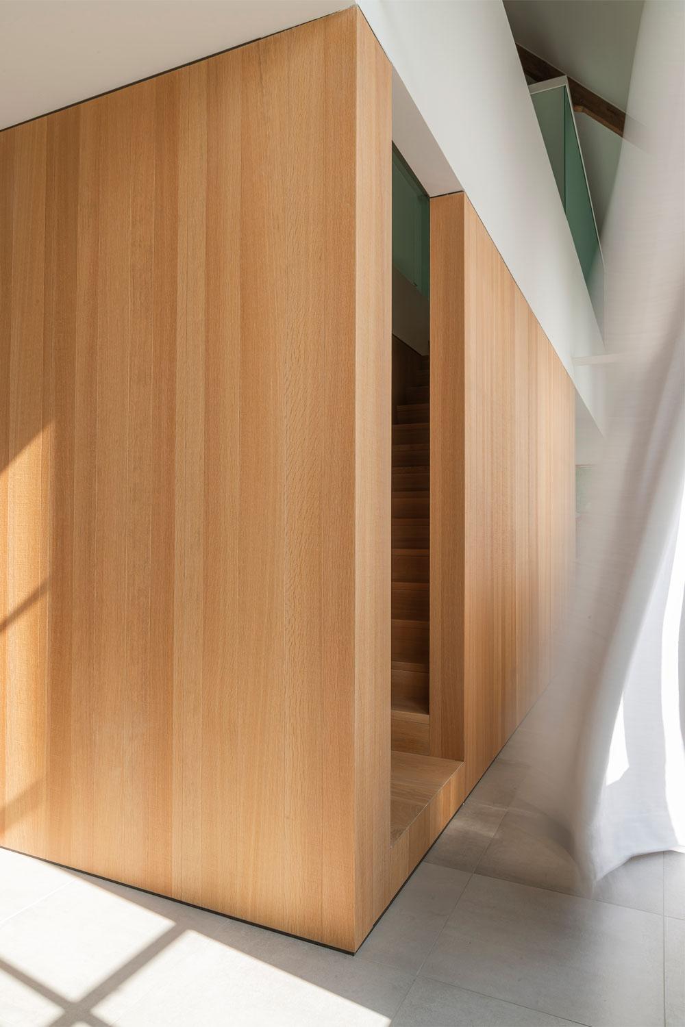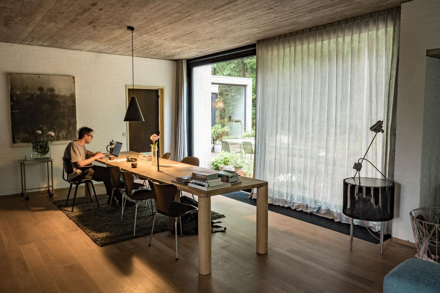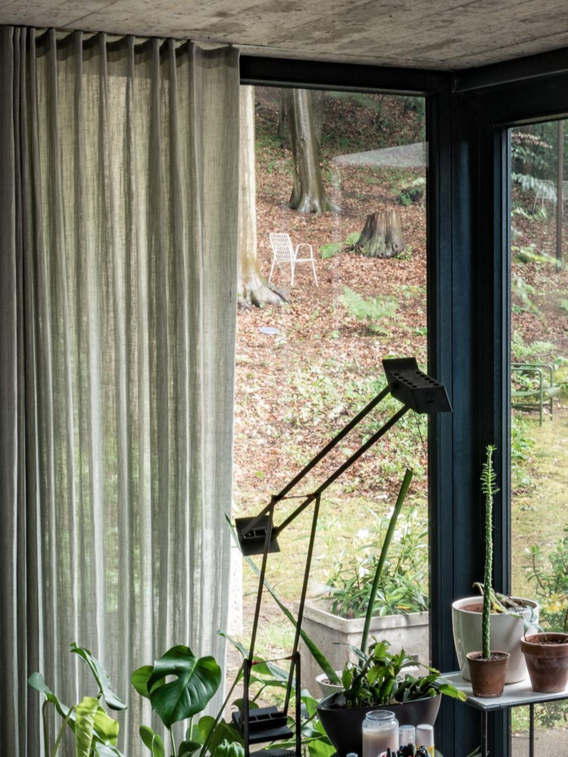 In dit staaltje van rationeel minimalisme, omgeven door groen en bomen, is er een onwaarschijnlijk mooie lichtinval. De gordijnen in de leefruimte, een linnen-wol mengeling, zijn subtiel aanwezig om zo de oorspronkelijke materialen, die overal terugkomen in de woning, te respecteren.
