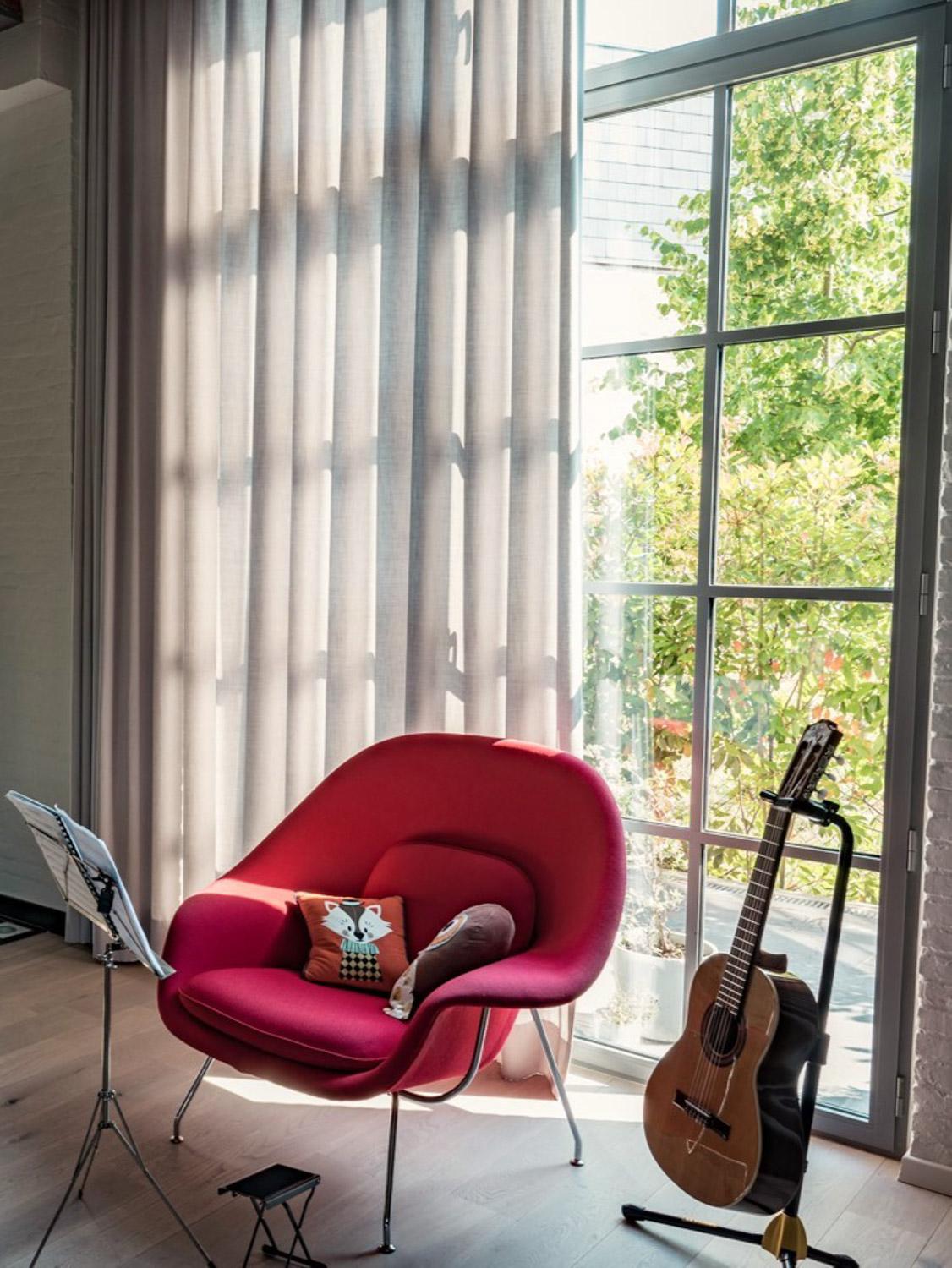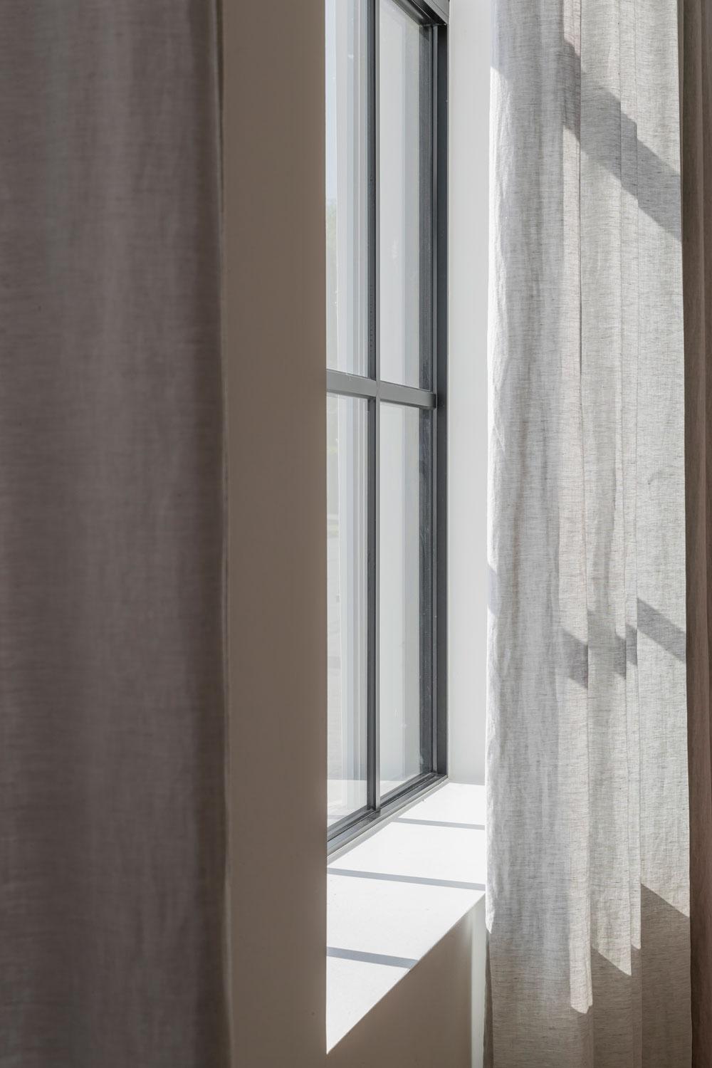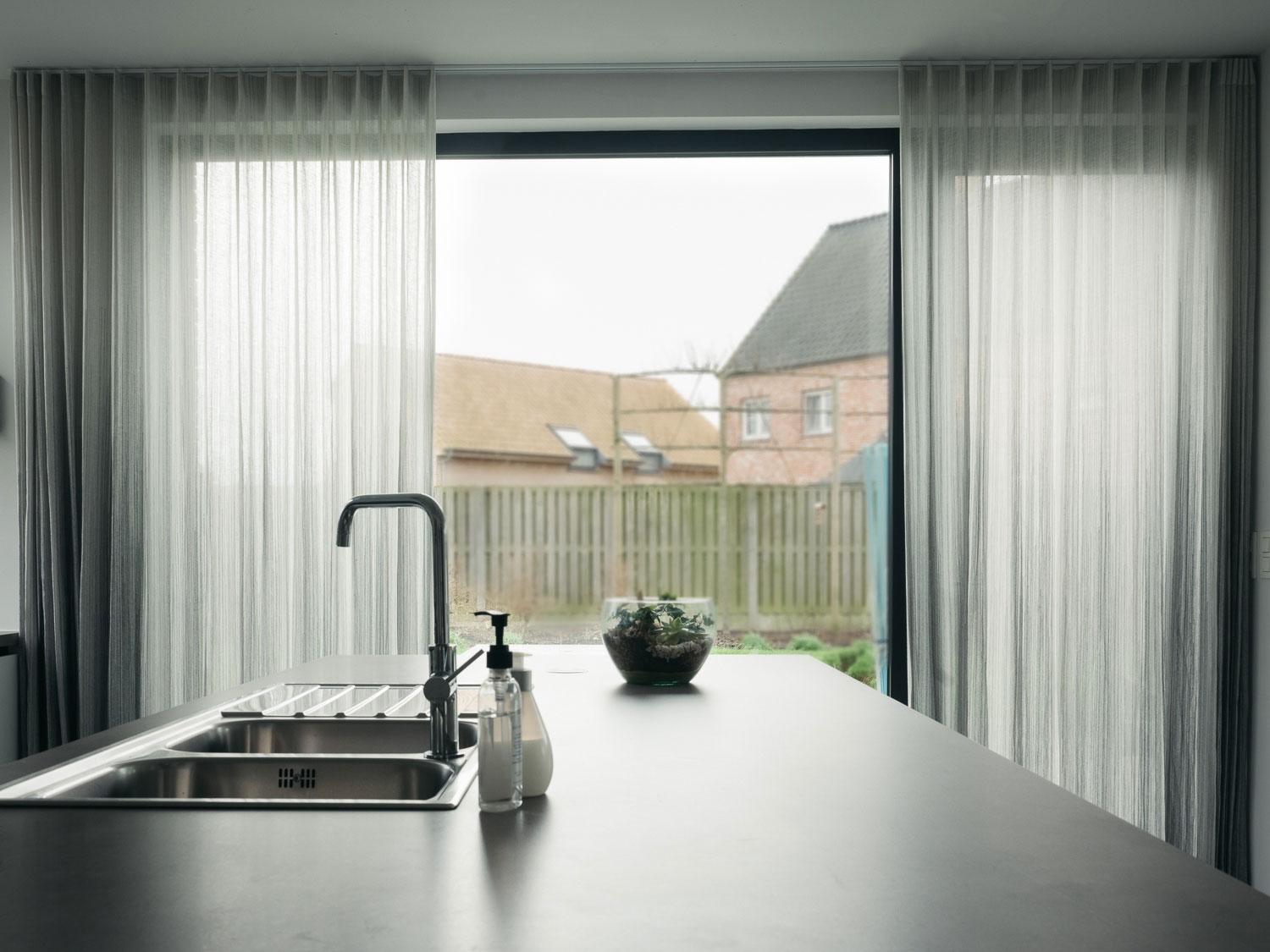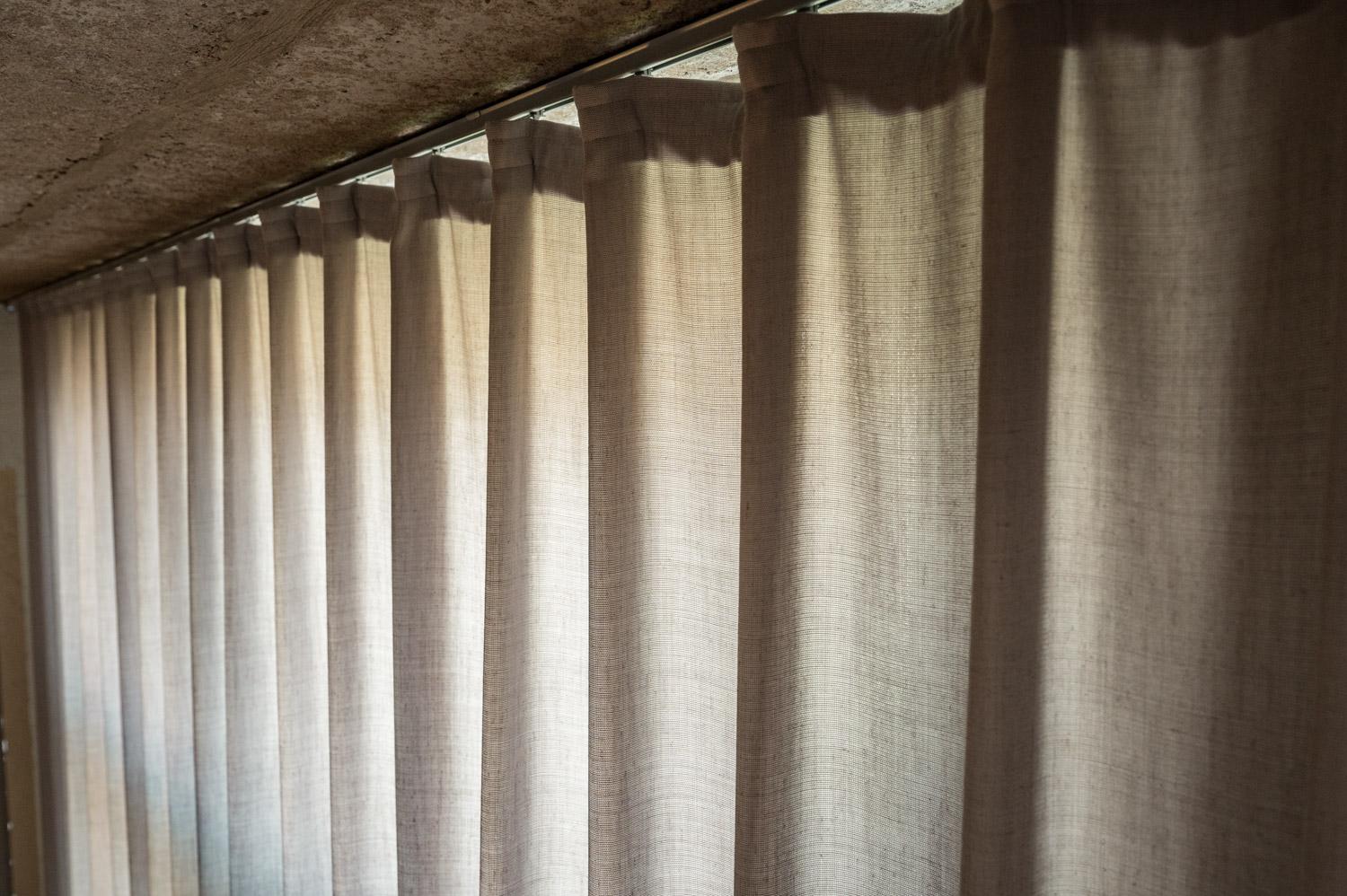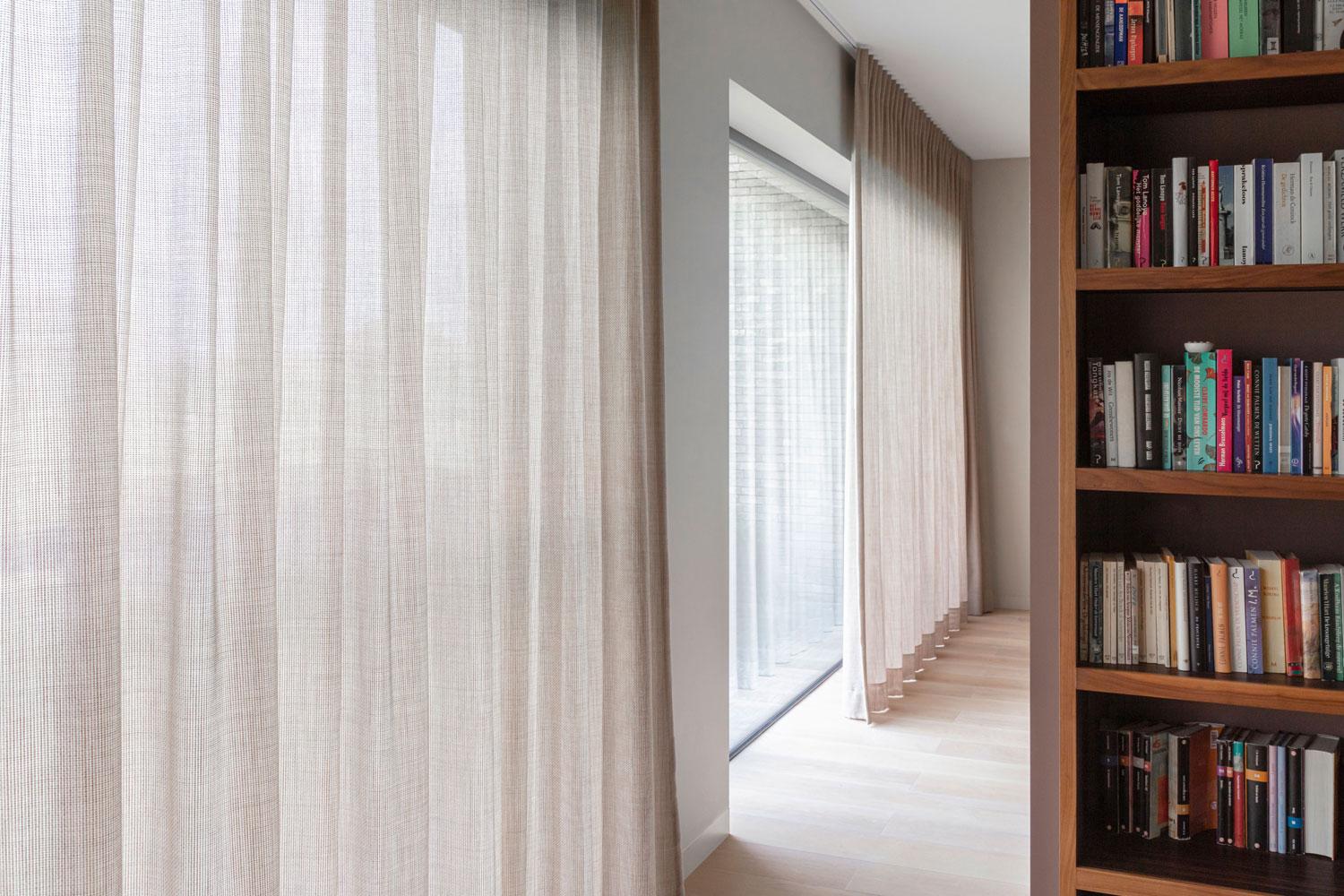 Voor de ramen aan de buitengevel in de leefruimte werd er gekozen voor een gordijn dat qua kleur en gevoel blendt met de tint en textuur van de muren. De stof is volledig afsluitend maar toch nog lichtdoorlatend. Zo blijft er, indien gesloten in volle zomer, voldoende licht aanwezig in de leeftruimte, want de lange gevelmuur geeft uit op het zuiden.