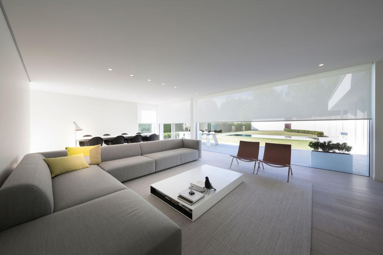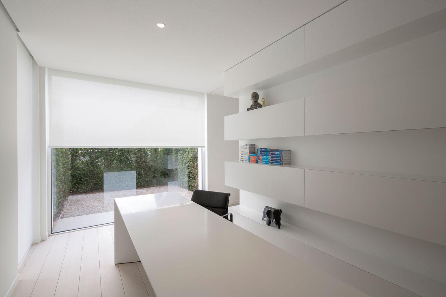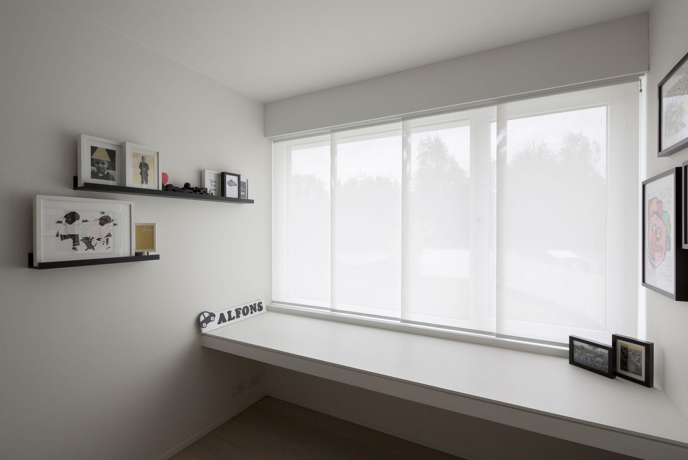 Dankzij onze vroege betrokkenheid, konden alle voorzieningen zoals bv. de inbouwnissen correct gemaakt worden. We adviseerden witte, zonwerende screendoeken omdat die overlopen in het kleur van de muren en zo een rustig en strak gevoel geven. Op de bovenverdieping werd geopteerd voor dezelfde screendoeken in japanse schuifpanelen. Zo is er over de verdiepingen heen een uniforme look en feel gecreëerd.