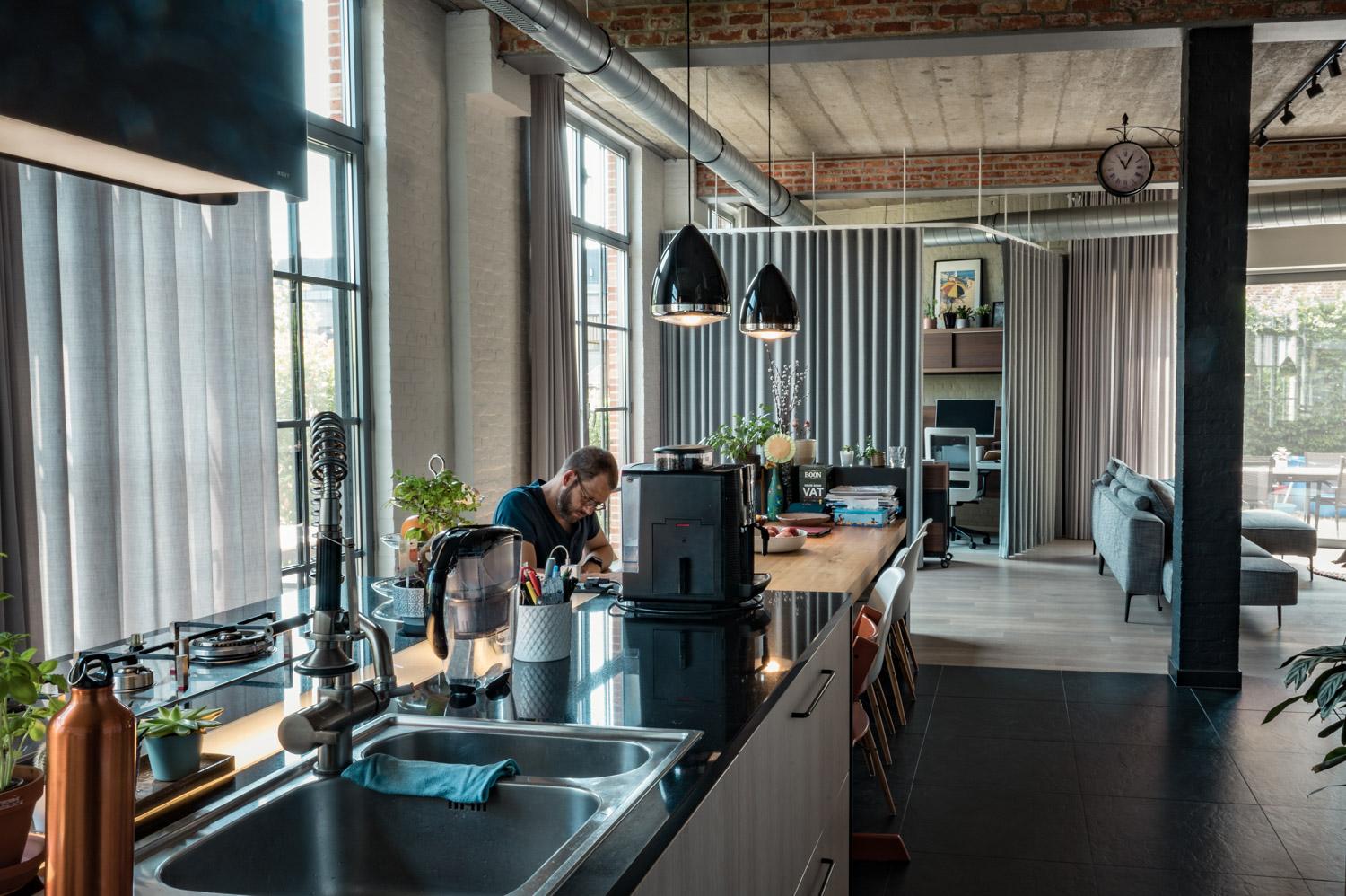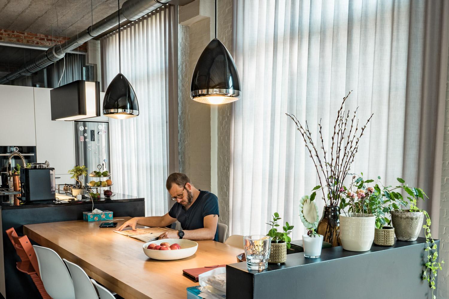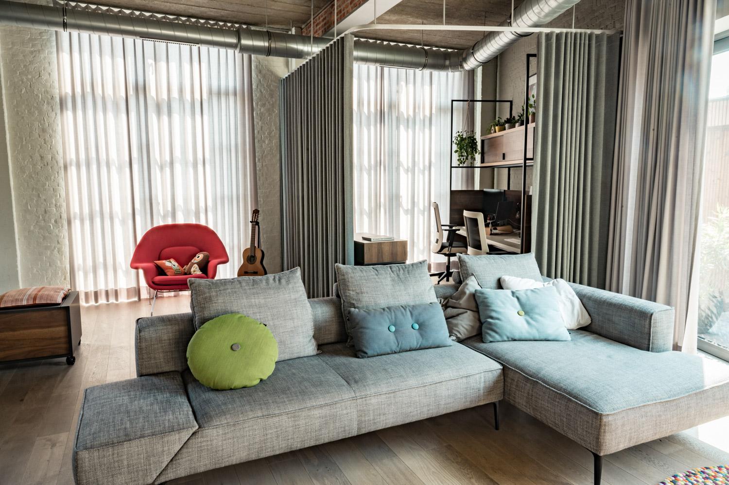 Aan kant van de inkom, met zicht op de ommuurde buitenruimte stellen we een strakkere rolgordijnen voor. Dit geeft een mooi contrast met de gordijnen en heeft een minder opvallend karakter, ideaal voor dit gedeelte van de loft, deels ook gang naar de slaapkamers.