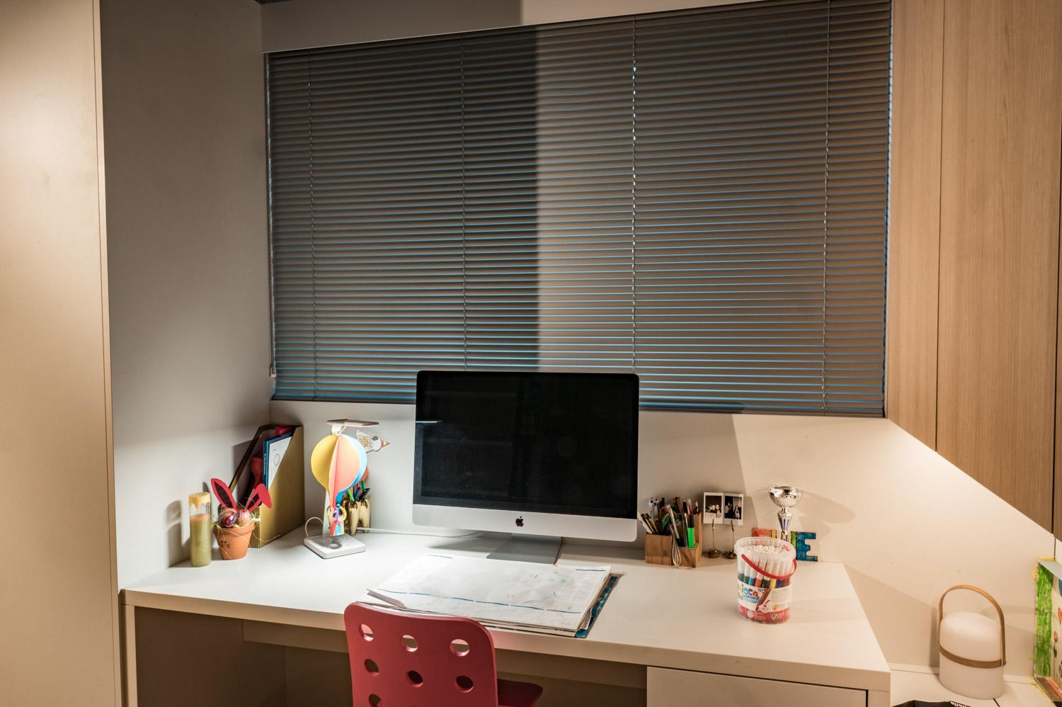 Door de neutrale kleur hier en de montage in de dagkant van de ramen, blijft de vormgeving strak, terwijl de horizontale lijnen toch zorgen voor een speels accent.