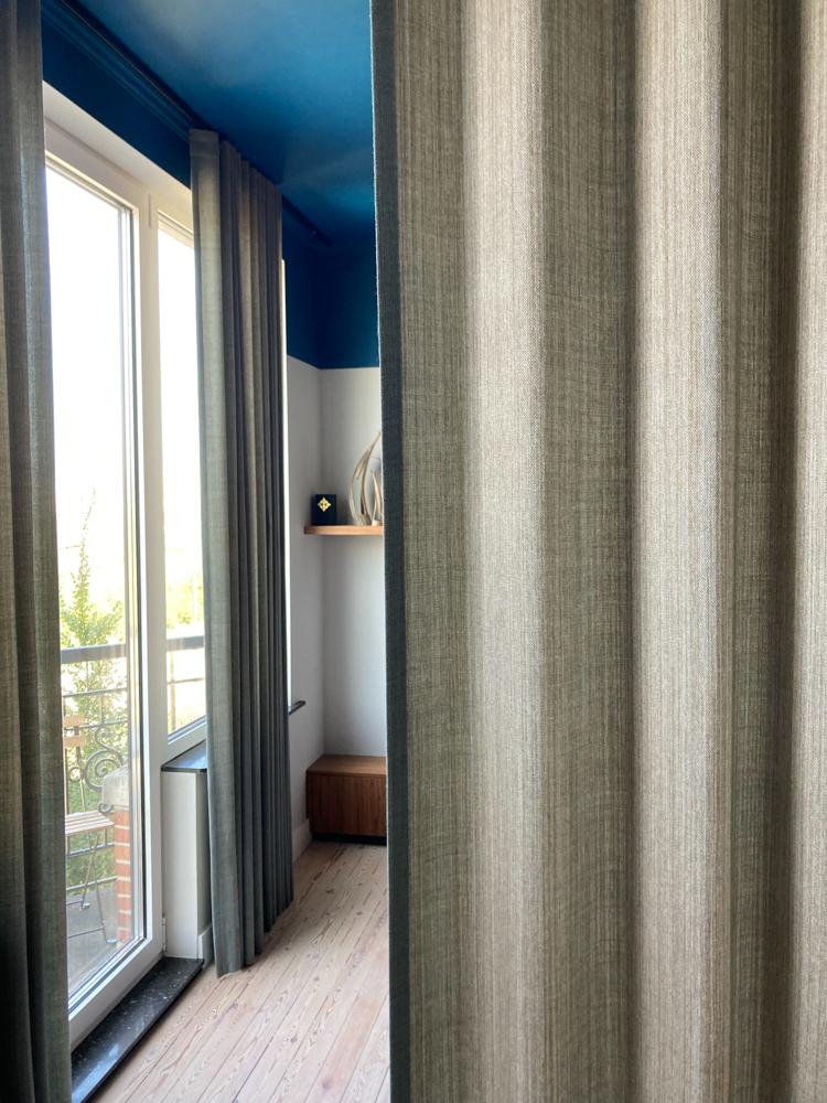 Het overgordijn is aan de 2 kanten zichtbaar en verschillend van textuur. De kant naar de slaapkamer heeft de look en feel van een wollen kwaliteit. De subtiele tint van blauw in de weving past heel goed met het blauw geschilderde plafond. De stof is volledig afsluitend maar toch nog lichtdoorlatend. De andere (achter)kant van de stof heeft een bruinere tint met een verticaal lijnmotief, die dan met de natuurlijke tinten van de badkamer mooi samenvalt.