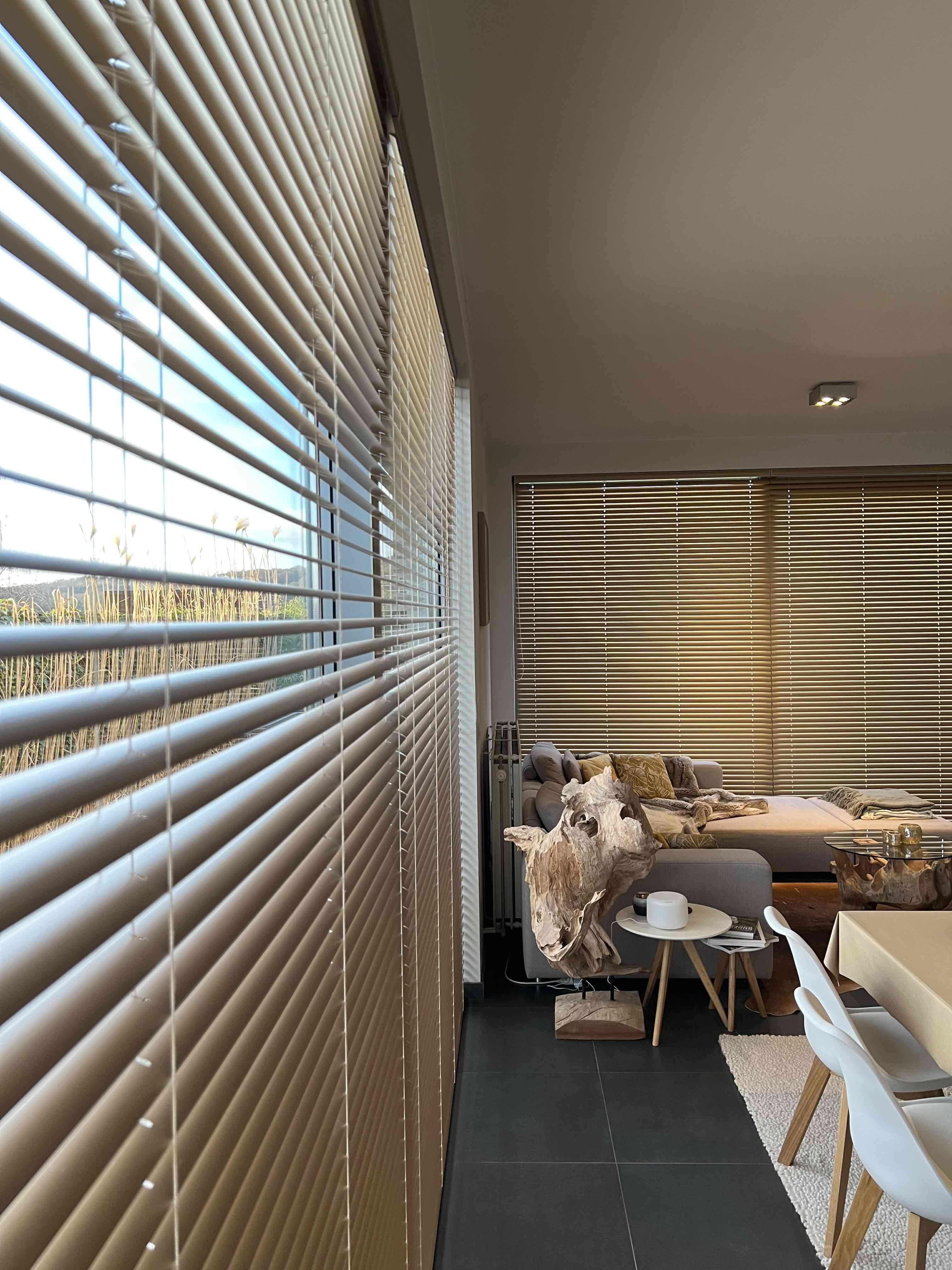Daarom stelden we een mat goud bronzen tint in 50mm aluminium voor. De kleur geeft een mooie gloed aan het interieur. De bredere lamellen passen qua verhouding beter bij het raam. De kettingbediening zorgt dan weer voor een vlotte bediening.