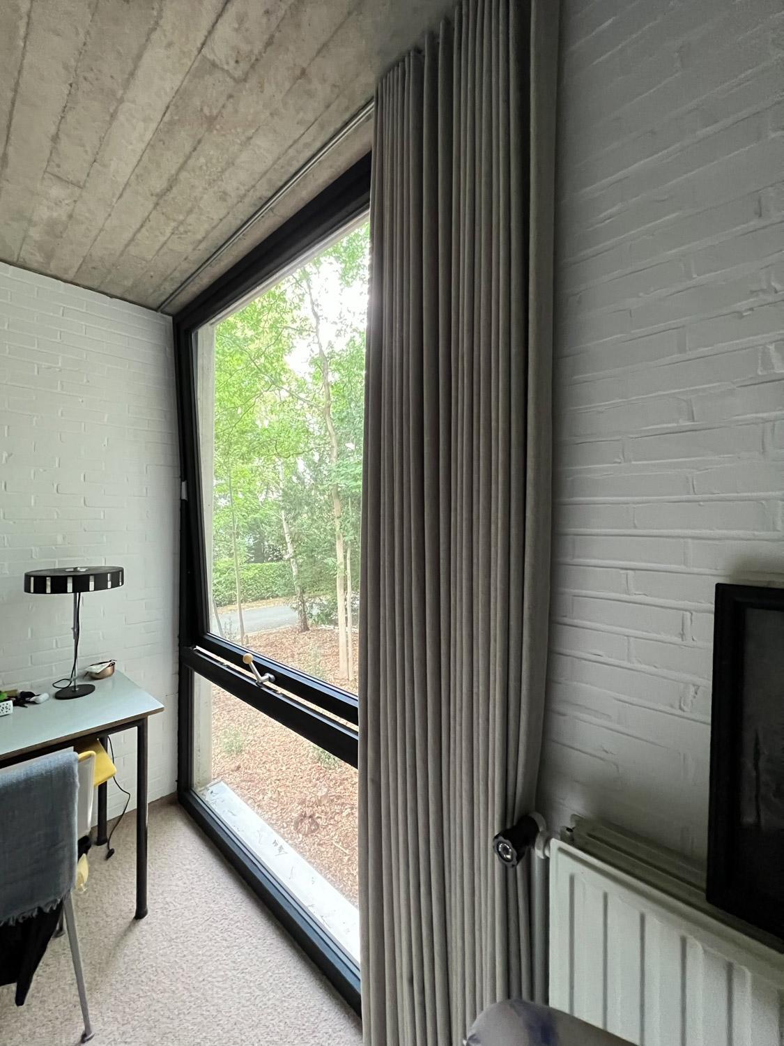 Een bijzonder goed glijdende gordijnrail voor grote oppervlakten werd ingewerkt in een massieve houten balk. Een goede coördinatie tussen architect, timmerman en onszelf hebben dit tot een mooi warm eindresultaat gebracht.